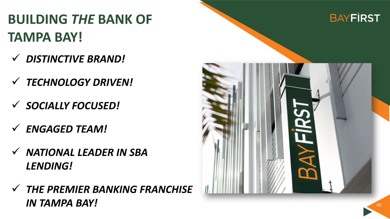 BUILDING THE BANK OF TAMPA BAY! 40  DISTINCTIVE BRAND!  TECHNOLOGY DRIVEN!  SOCIALLY FOCUSED!  ENGAGED TEAM!  NATIONAL LEADER IN SBA LENDING!  THE PREMIER BANKING FRANCHISE IN TAMPA BAY!