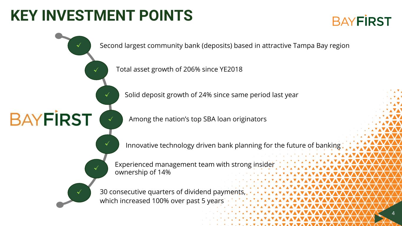 3 ABOUT BAYFIRST FINANCIAL CORP. TAMPA BAY’S PREMIER BANKING FRANCHISE IN THE TAMPA BAY/ SARASOTA REGION(1) HOW WE RANK 2 ASSET SIZE BILLION TOTAL ASSETS (2)$1.12 SBA ORIGINATION SBA 7(a) ORIGINATOR IN THE NATION (3) #5 GROWTH ASSET GROWTH SINCE DEC 31, 2018(2)206% 1. Deposit ranking of banks with assets less than $10B headquartered in the Tampa/Sarasota region as of September 30, 2023 from Uniform Bank Performance Reports 2. Financial data as of December 31, 2023 3. As of SBA’s quarter ended December 31, 2023 INITIATIVES ENVIRONMENTAL, SOCIAL, AND GOVERNANCE FOCUSED ESG DEPOSITS 19% TRANSACTION ACCOUNT BALANCE GROWTH DURING THE YEAR(2) BANKING CENTERS THE FOURTH BANKING CENTER IN SARASOTA-BRADENTON AREA OPENED IN NORTH SARASOTA IN DECEMBER BRINGING THE TOTAL BANKING CENTERS TO 11 IN THE TAMPA BAY REGION