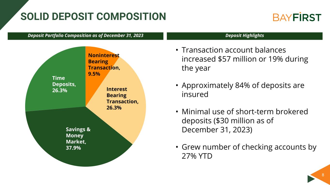 7 ATTRACTIVE LOAN COMPOSITION Composition of Loans Held for Investment as of December 31, 2023 28.0% 18.0% 11.1% 28.9% 5.5% 2.9% 0.5% 5.2% C&I Residential HELOC Owner-occupied nonfarm/nonresidential Other nonfarm/nonresidential C&D Multifamily residential and farmland Consumer & Other Loan Highlights • Loan portfolio is well-diversified across major loan types with a low concentration of non owner-occupied commercial real estate loans • Total loan production of $202 million during the quarter • Loans held for investment grew $49 million during the quarter (1) (1) Excludes PPP loans
