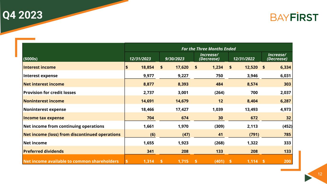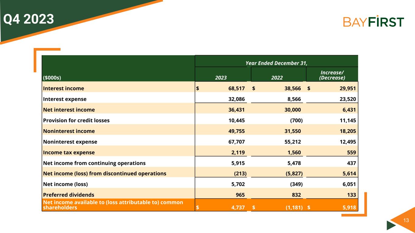 12 Q4 2023 For the Three Months Ended ($000s) 12/31/2023 9/30/2023 Increase/ (Decrease) 12/31/2022 Increase/ (Decrease) Interest income $ 18,854 $ 17,620 $ 1,234 $ 12,520 $ 6,334 Interest expense 9,977 9,227 750 3,946 6,031 Net interest income 8,877 8,393 484 8,574 303 Provision for credit losses 2,737 3,001 (264) 700 2,037 Noninterest income 14,691 14,679 12 8,404 6,287 Noninterest expense 18,466 17,427 1,039 13,493 4,973 Income tax expense 704 674 30 672 32 Net income from continuing operations 1,661 1,970 (309) 2,113 (452) Net income (loss) from discontinued operations (6) (47) 41 (791) 785 Net income 1,655 1,923 (268) 1,322 333 Preferred dividends 341 208 133 208 133 Net income available to common shareholders $ 1,314 $ 1,715 $ (401) $ 1,114 $ 200