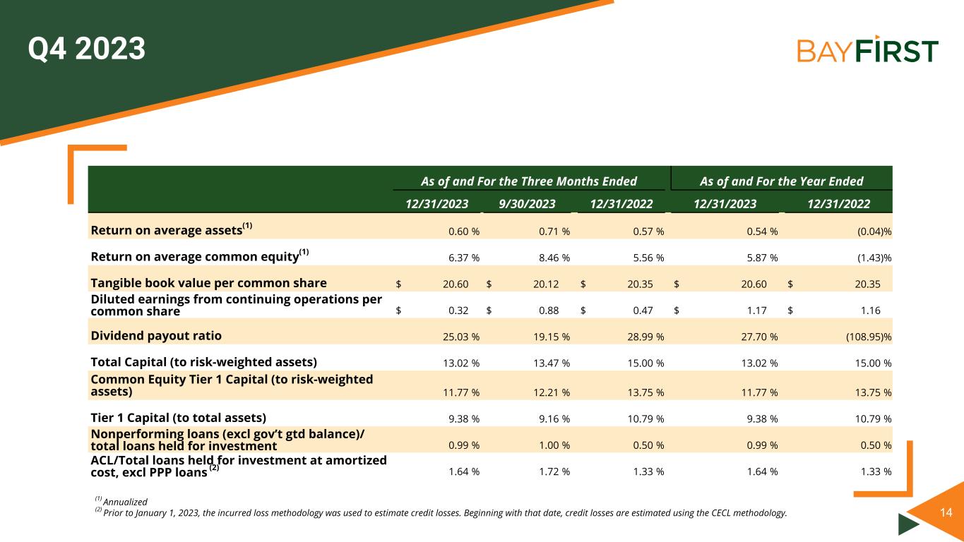 13 Q4 2023 Year Ended December 31, ($000s) 2023 2022 Increase/ (Decrease) Interest income $ 68,517 $ 38,566 $ 29,951 Interest expense 32,086 8,566 23,520 Net interest income 36,431 30,000 6,431 Provision for credit losses 10,445 (700) 11,145 Noninterest income 49,755 31,550 18,205 Noninterest expense 67,707 55,212 12,495 Income tax expense 2,119 1,560 559 Net income from continuing operations 5,915 5,478 437 Net income (loss) from discontinued operations (213) (5,827) 5,614 Net income (loss) 5,702 (349) 6,051 Preferred dividends 965 832 133 Net income available to (loss attributable to) common shareholders $ 4,737 $ (1,181) $ 5,918
