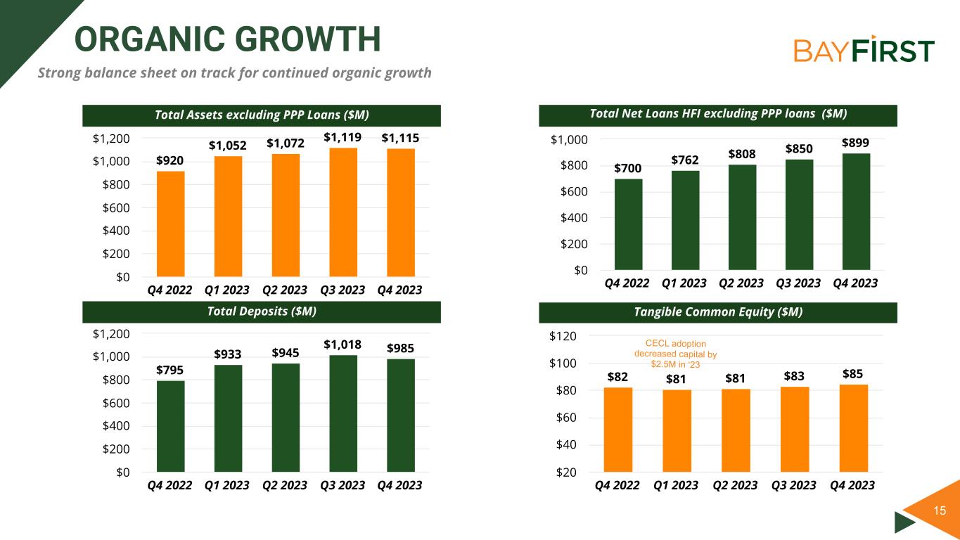 14 Q4 2023 As of and For the Three Months Ended As of and For the Year Ended 12/31/2023 9/30/2023 12/31/2022 12/31/2023 12/31/2022 Return on average assets(1) 0.60 % 0.71 % 0.57 % 0.54 % (0.04) % Return on average common equity(1) 6.37 % 8.46 % 5.56 % 5.87 % (1.43) % Tangible book value per common share $ 20.60 $ 20.12 $ 20.35 $ 20.60 $ 20.35 Diluted earnings from continuing operations per common share $ 0.32 $ 0.88 $ 0.47 $ 1.17 $ 1.16 Dividend payout ratio 25.03 % 19.15 % 28.99 % 27.70 % (108.95) % Total Capital (to risk-weighted assets) 13.02 % 13.47 % 15.00 % 13.02 % 15.00 % Common Equity Tier 1 Capital (to risk-weighted assets) 11.77 % 12.21 % 13.75 % 11.77 % 13.75 % Tier 1 Capital (to total assets) 9.38 % 9.16 % 10.79 % 9.38 % 10.79 % Nonperforming loans (excl gov’t gtd balance)/ total loans held for investment 0.99 % 1.00 % 0.50 % 0.99 % 0.50 % ACL/Total loans held for investment at amortized cost, excl PPP loans (2) 1.64 % 1.72 % 1.33 % 1.64 % 1.33 % (1) Annualized (2) Prior to January 1, 2023, the incurred loss methodology was used to estimate credit losses. Beginning with that date, credit losses are estimated using the CECL methodology.