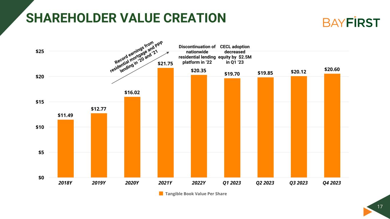 16 RETURN TO PROFITABILITY ROAA (%)(1) ROATCE (%)(1) Net Interest Margin (%)(1) Noninterest Income / Total Revenue from Continuing Operations 0.57% 0.30% 0.52% 0.71% 0.60% Q4 2022 Q1 2023 Q2 2023 Q3 2023 Q4 2023 0.00% 0.50% 1.00% 5.56% 2.69% 5.86% 8.46% 6.37% Q4 2022 Q1 2023 Q2 2023 Q3 2023 Q4 2023 0.00% 5.00% 10.00% 15.00% 4.19% 4.17% 4.18% 3.36% 3.48% Q4 2022 Q1 2023 Q2 2023 Q3 2023 Q4 2023 0.00% 1.00% 2.00% 3.00% 4.00% 5.00% 49.50% 51.07% 51.97% 63.62% 62.33% Q4 2022 Q1 2023 Q2 2023 Q3 2023 Q4 2023 20% 30% 40% 50% 60% 70% (1) Annualized