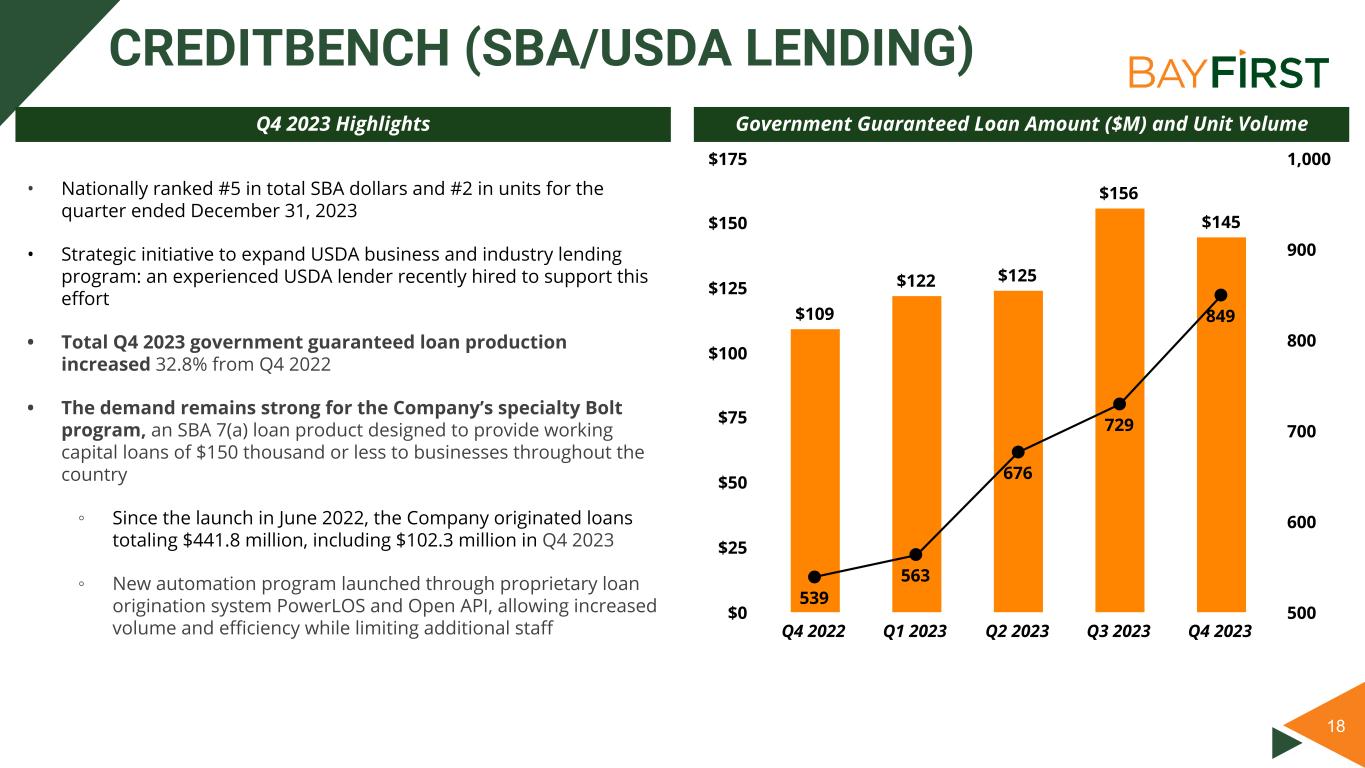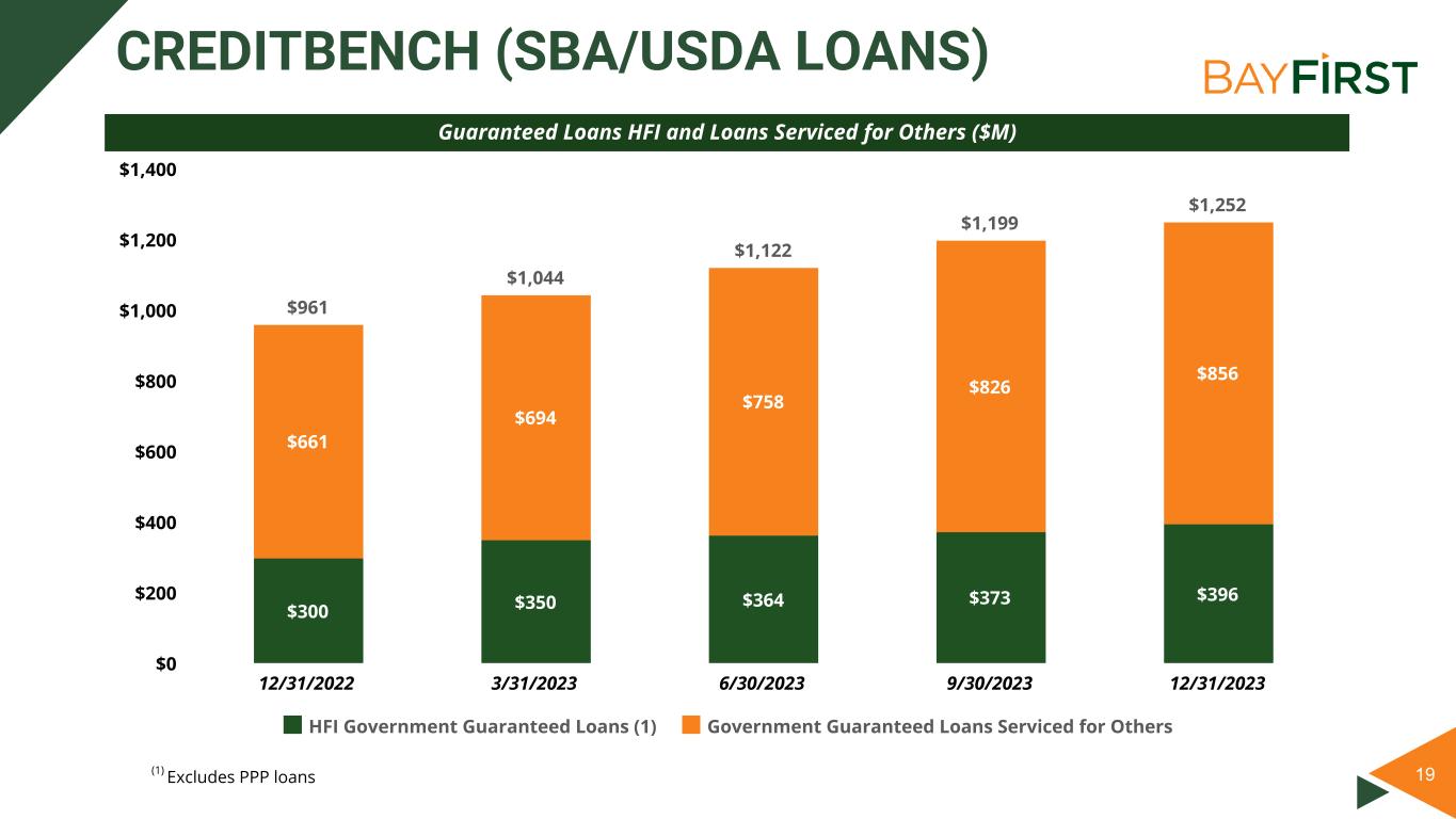 18 $109 $122 $125 $156 $145 539 563 676 729 849 Q4 2022 Q1 2023 Q2 2023 Q3 2023 Q4 2023 $0 $25 $50 $75 $100 $125 $150 $175 500 600 700 800 900 1,000 • Nationally ranked #5 in total SBA dollars and #2 in units for the quarter ended December 31, 2023 • Strategic initiative to expand USDA business and industry lending program: an experienced USDA lender recently hired to support this effort • Total Q4 2023 government guaranteed loan production increased 32.8% from Q4 2022 • The demand remains strong for the Company’s specialty Bolt program, an SBA 7(a) loan product designed to provide working capital loans of $150 thousand or less to businesses throughout the country ◦ Since the launch in June 2022, the Company originated loans totaling $441.8 million, including $102.3 million in Q4 2023 ◦ New automation program launched through proprietary loan origination system PowerLOS and Open API, allowing increased volume and efficiency while limiting additional staff CREDITBENCH (SBA/USDA LENDING) Q4 2023 Highlights Government Guaranteed Loan Amount ($M) and Unit Volume