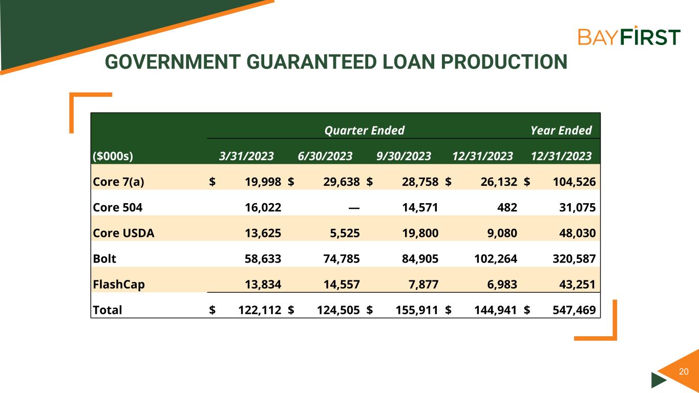 20 Quarter Ended Year Ended ($000s) 3/31/2023 6/30/2023 9/30/2023 12/31/2023 12/31/2023 Core 7(a) $ 19,998 $ 29,638 $ 28,758 $ 26,132 $ 104,526 Core 504 16,022 — 14,571 482 31,075 Core USDA 13,625 5,525 19,800 9,080 48,030 Bolt 58,633 74,785 84,905 102,264 320,587 FlashCap 13,834 14,557 7,877 6,983 43,251 Total $ 122,112 $ 124,505 $ 155,911 $ 144,941 $ 547,469 GOVERNMENT GUARANTEED LOAN PRODUCTION