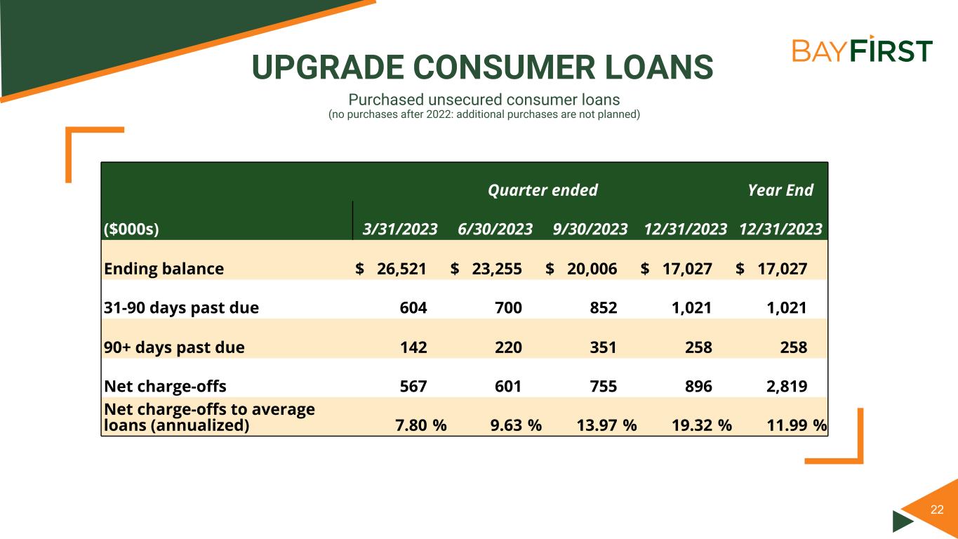 22 Quarter ended Year End ($000s) 3/31/2023 6/30/2023 9/30/2023 12/31/2023 12/31/2023 Ending balance $ 26,521 $ 23,255 $ 20,006 $ 17,027 $ 17,027 31-90 days past due 604 700 852 1,021 1,021 90+ days past due 142 220 351 258 258 Net charge-offs 567 601 755 896 2,819 Net charge-offs to average loans (annualized) 7.80 % 9.63 % 13.97 % 19.32 % 11.99 % UPGRADE CONSUMER LOANS Purchased unsecured consumer loans (no purchases after 2022: additional purchases are not planned)