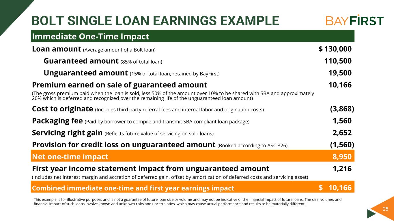 25 BOLT SINGLE LOAN EARNINGS EXAMPLE Immediate One-Time Impact Loan amount (Average amount of a Bolt loan) $ 130,000 Guaranteed amount (85% of total loan) 110,500 Unguaranteed amount (15% of total loan, retained by BayFirst) 19,500 Premium earned on sale of guaranteed amount 10,166 (The gross premium paid when the loan is sold, less 50% of the amount over 10% to be shared with SBA and approximately 20% which is deferred and recognized over the remaining life of the unguaranteed loan amount) Cost to originate (Includes third party referral fees and internal labor and origination costs) (3,868) Packaging fee (Paid by borrower to compile and transmit SBA compliant loan package) 1,560 Servicing right gain (Reflects future value of servicing on sold loans) 2,652 Provision for credit loss on unguaranteed amount (Booked according to ASC 326) (1,560) Net one-time impact 8,950 First year income statement impact from unguaranteed amount 1,216 (Includes net interest margin and accretion of deferred gain, offset by amortization of deferred costs and servicing asset) Combined immediate one-time and first year earnings impact $ 10,166 This example is for illustrative purposes and is not a guarantee of future loan size or volume and may not be indicative of the financial impact of future loans. The size, volume, and financial impact of such loans involve known and unknown risks and uncertainties, which may cause actual performance and results to be materially different.
