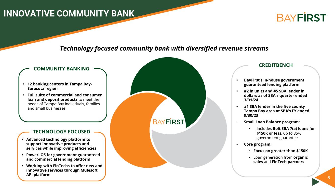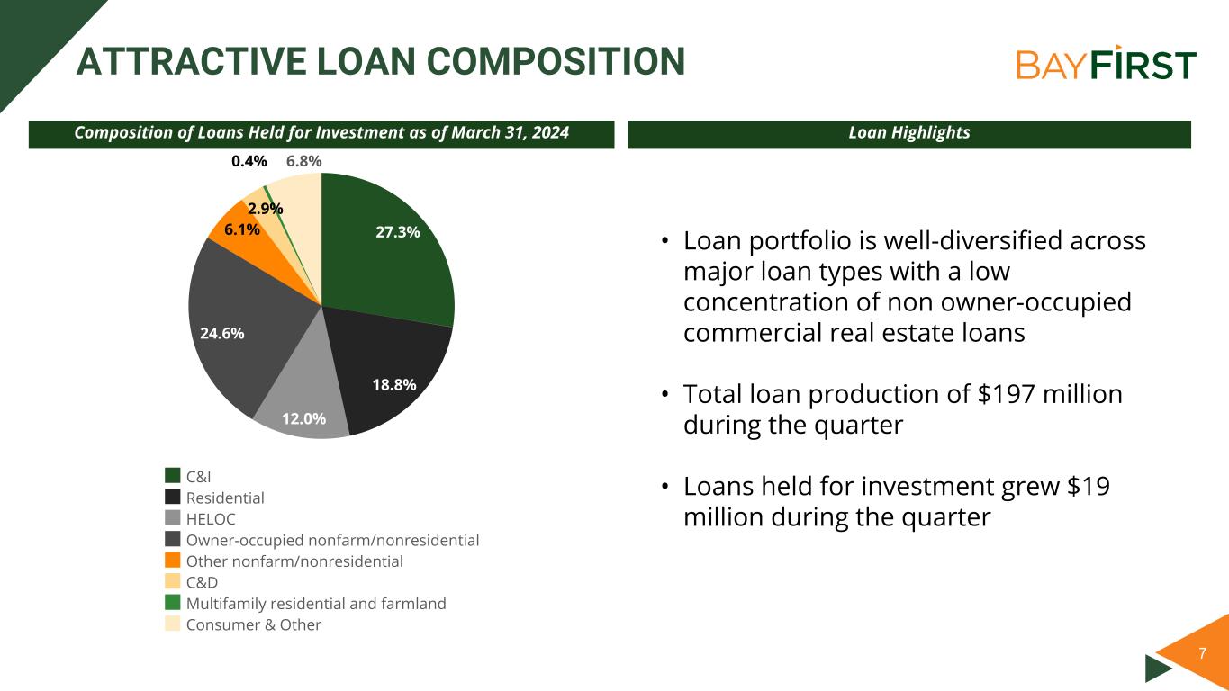 6 • Advanced technology platform to support innovative products and services while improving efficiencies • PowerLOS for government guaranteed and commercial lending platform • Working with FinTechs to offer new and innovative services through Mulesoft API platform • 12 banking centers in Tampa Bay- Sarasota region • Full suite of commercial and consumer loan and deposit products to meet the needs of Tampa Bay individuals, families and small businesses • BayFirst’s in-house government guaranteed lending platform • #2 in units and #5 SBA lender in dollars as of SBA's quarter ended 3/31/24 • #1 SBA lender in the five county Tampa Bay area at SBA’s FY ended 9/30/23 ◦ Small Loan Balance program: ▪ Includes Bolt SBA 7(a) loans for $150K or less, up to 85% government guarantee • Core program: ▪ Focus on greater than $150K ▪ Loan generation from organic sales and FinTech partners COMMUNITY BANKING TECHNOLOGY FOCUSED INNOVATIVE COMMUNITY BANK Technology focused community bank with diversified revenue streams CREDITBENCH
