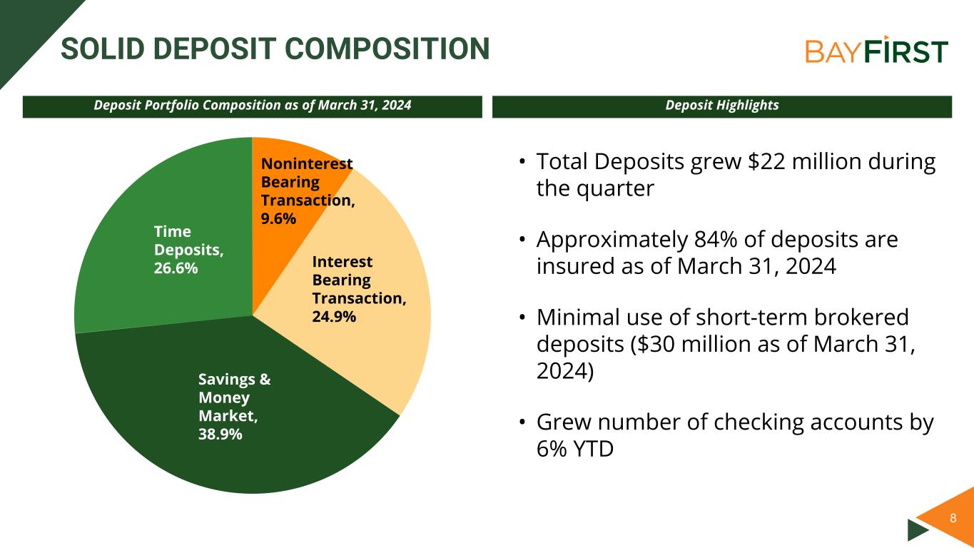 7 ATTRACTIVE LOAN COMPOSITION Composition of Loans Held for Investment as of March 31, 2024 27.3% 18.8% 12.0% 24.6% 6.1% 2.9% 0.4% 6.8% C&I Residential HELOC Owner-occupied nonfarm/nonresidential Other nonfarm/nonresidential C&D Multifamily residential and farmland Consumer & Other Loan Highlights • Loan portfolio is well-diversified across major loan types with a low concentration of non owner-occupied commercial real estate loans • Total loan production of $197 million during the quarter • Loans held for investment grew $19 million during the quarter