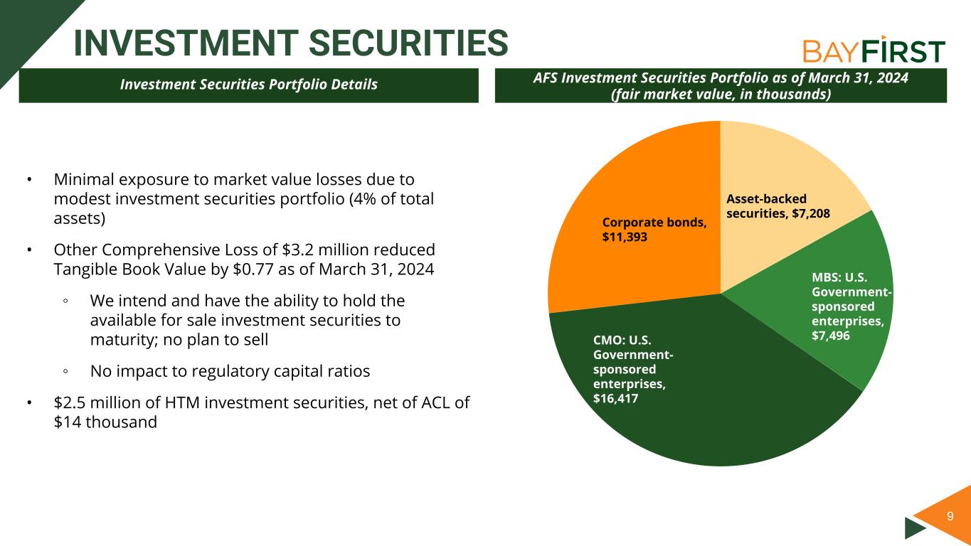 8 SOLID DEPOSIT COMPOSITION Deposit Portfolio Composition as of March 31, 2024 • Total Deposits grew $22 million during the quarter • Approximately 84% of deposits are insured as of March 31, 2024 • Minimal use of short-term brokered deposits ($30 million as of March 31, 2024) • Grew number of checking accounts by 6% YTD Noninterest Bearing Transaction, 9.6% Interest Bearing Transaction, 24.9% Savings & Money Market, 38.9% Time Deposits, 26.6% Deposit Highlights