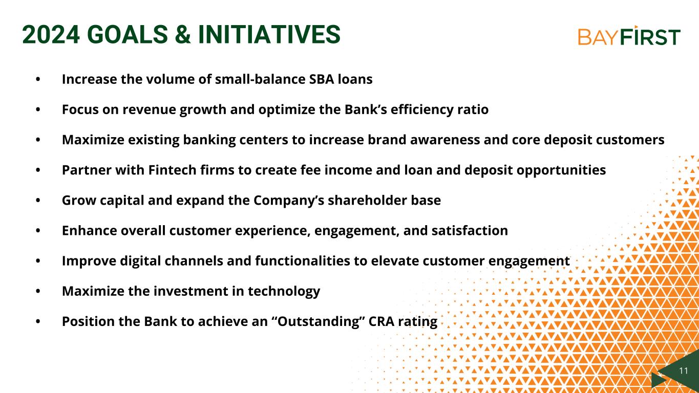 10 STRATEGIC PILLARS 2024 Maintain Strong Capital Manage and Evolve Risk Management Leverage Our SBA Expertise Promote Innovation Maintain Granularity of Deposit and Loan Portfolios Leverage Banking Center Franchise and Core Deposit Base Continue to Promote Workplace Culture and Social Responsibility