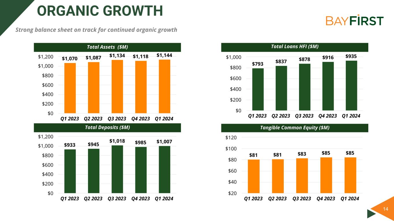 13 Q1 2024 As of and For the Three Months Ended 3/31/2024 12/31/2023 3/31/2023 Return on average assets(1) 0.29 % 0.60 % 0.30 % Return on average common equity(1) 2.06 % 6.37 % 2.69 % Tangible book value per common share $ 20.45 $ 20.60 $ 19.70 Diluted earnings per common share $ 0.11 $ 0.32 $ 0.13 Dividend payout ratio 74.91 % 25.03 % 61.48 % Total Capital (to risk-weighted assets) 12.29 % 13.03 % 14.12 % Common Equity Tier 1 Capital (to risk-weighted assets) 11.04 % 11.77 % 12.87 % Tier 1 Capital (to total assets) 9.12 % 9.38 % 10.18 % Nonperforming loans (excl gov’t gtd balance)/total loans held for investment(2) 0.88 % 1.00 % 0.29 % ACL/Total loans held for investment at amortized cost 1.62 % 1.64 % 1.69 % (1) Annualized (2) Excludes loans measured at fair value