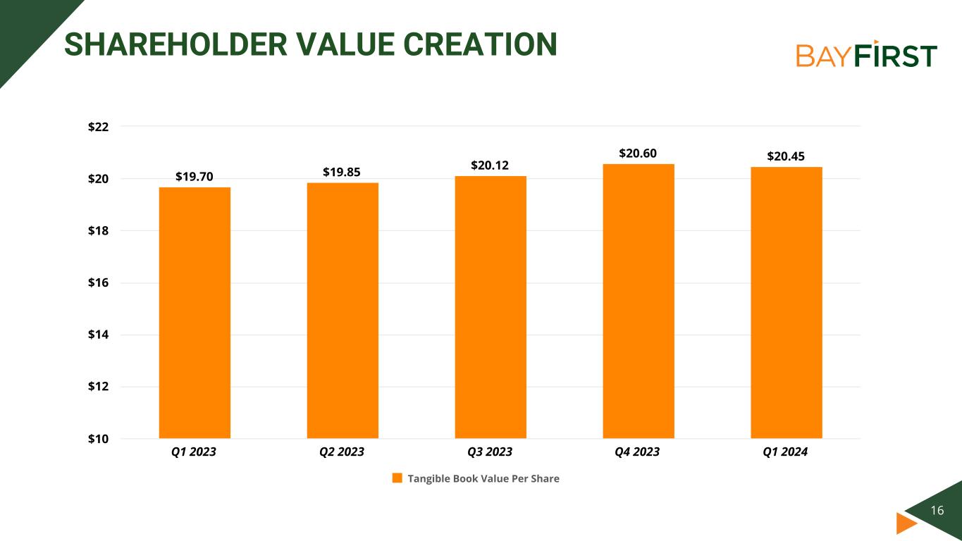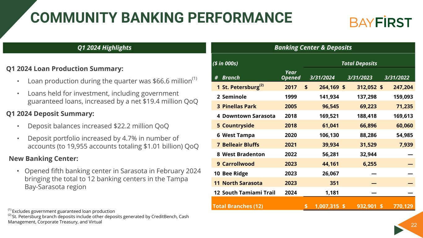 22 COMMUNITY BANKING PERFORMANCE Q1 2024 Loan Production Summary: ▪ Loan production during the quarter was $66.6 million(1) ▪ Loans held for investment, including government guaranteed loans, increased by a net $19.4 million QoQ Q1 2024 Deposit Summary: ▪ Deposit balances increased $22.2 million QoQ ▪ Deposit portfolio increased by 4.7% in number of accounts (to 19,955 accounts totaling $1.01 billion) QoQ New Banking Center: • Opened fifth banking center in Sarasota in February 2024 bringing the total to 12 banking centers in the Tampa Bay-Sarasota region Q1 2024 Highlights Banking Center & Deposits ($ in 000s) Total Deposits # Branch Year Opened 3/31/2024 3/31/2023 3/31/2022 1 St. Petersburg(2) 2017 $ 264,169 $ 312,052 $ 247,204 2 Seminole 1999 141,934 137,298 159,093 3 Pinellas Park 2005 96,545 69,223 71,235 4 Downtown Sarasota 2018 169,521 188,418 169,613 5 Countryside 2018 61,041 66,896 60,060 6 West Tampa 2020 106,130 88,286 54,985 7 Belleair Bluffs 2021 39,934 31,529 7,939 8 West Bradenton 2022 56,281 32,944 — 9 Carrollwood 2023 44,161 6,255 — 10 Bee Ridge 2023 26,067 — — 11 North Sarasota 2023 351 — — 12 South Tamiami Trail 2024 1,181 — — Total Branches (12) $ 1,007,315 $ 932,901 $ 770,129 (1) Excludes government guaranteed loan production (2) St. Petersburg branch deposits include other deposits generated by CreditBench, Cash Management, Corporate Treasury, and Virtual
