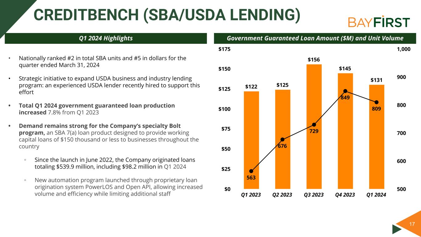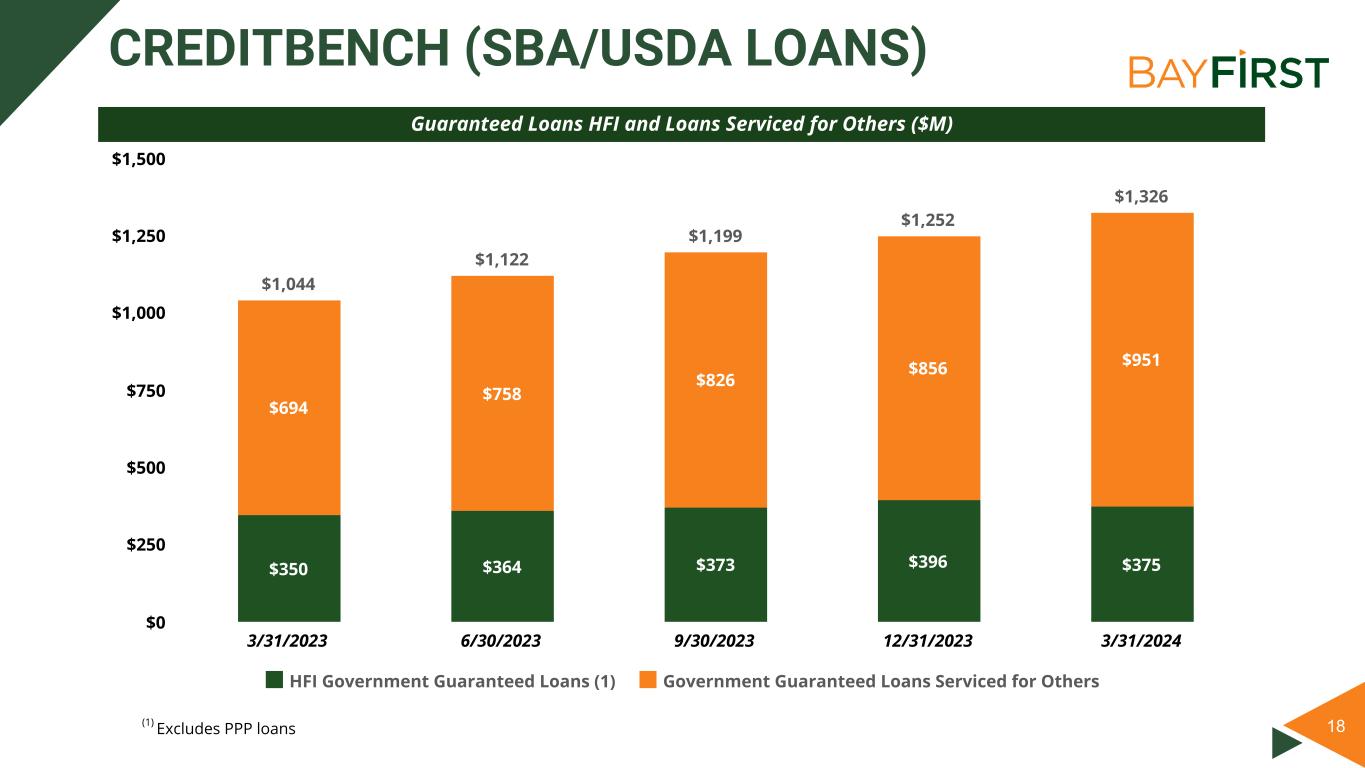 17 $122 $125 $156 $145 $131 563 676 729 849 809 Q1 2023 Q2 2023 Q3 2023 Q4 2023 Q1 2024 $0 $25 $50 $75 $100 $125 $150 $175 500 600 700 800 900 1,000 • Nationally ranked #2 in total SBA units and #5 in dollars for the quarter ended March 31, 2024 • Strategic initiative to expand USDA business and industry lending program: an experienced USDA lender recently hired to support this effort • Total Q1 2024 government guaranteed loan production increased 7.8% from Q1 2023 • Demand remains strong for the Company’s specialty Bolt program, an SBA 7(a) loan product designed to provide working capital loans of $150 thousand or less to businesses throughout the country ◦ Since the launch in June 2022, the Company originated loans totaling $539.9 million, including $98.2 million in Q1 2024 ◦ New automation program launched through proprietary loan origination system PowerLOS and Open API, allowing increased volume and efficiency while limiting additional staff CREDITBENCH (SBA/USDA LENDING) Q1 2024 Highlights Government Guaranteed Loan Amount ($M) and Unit Volume