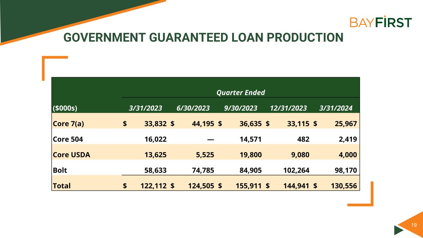 18 $1,044 $1,122 $1,199 $1,252 $1,326 $350 $364 $373 $396 $375 $694 $758 $826 $856 $951 HFI Government Guaranteed Loans (1) Government Guaranteed Loans Serviced for Others 3/31/2023 6/30/2023 9/30/2023 12/31/2023 3/31/2024 $0 $250 $500 $750 $1,000 $1,250 $1,500 CREDITBENCH (SBA/USDA LOANS) Guaranteed Loans HFI and Loans Serviced for Others ($M) (1) Excludes PPP loans