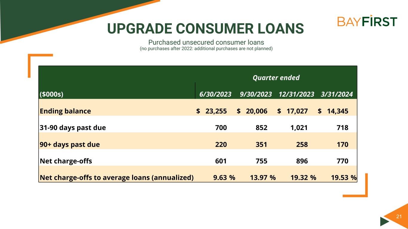 21 Quarter ended ($000s) 6/30/2023 9/30/2023 12/31/2023 3/31/2024 Ending balance $ 23,255 $ 20,006 $ 17,027 $ 14,345 31-90 days past due 700 852 1,021 718 90+ days past due 220 351 258 170 Net charge-offs 601 755 896 770 Net charge-offs to average loans (annualized) 9.63 % 13.97 % 19.32 % 19.53 % UPGRADE CONSUMER LOANS Purchased unsecured consumer loans (no purchases after 2022: additional purchases are not planned)
