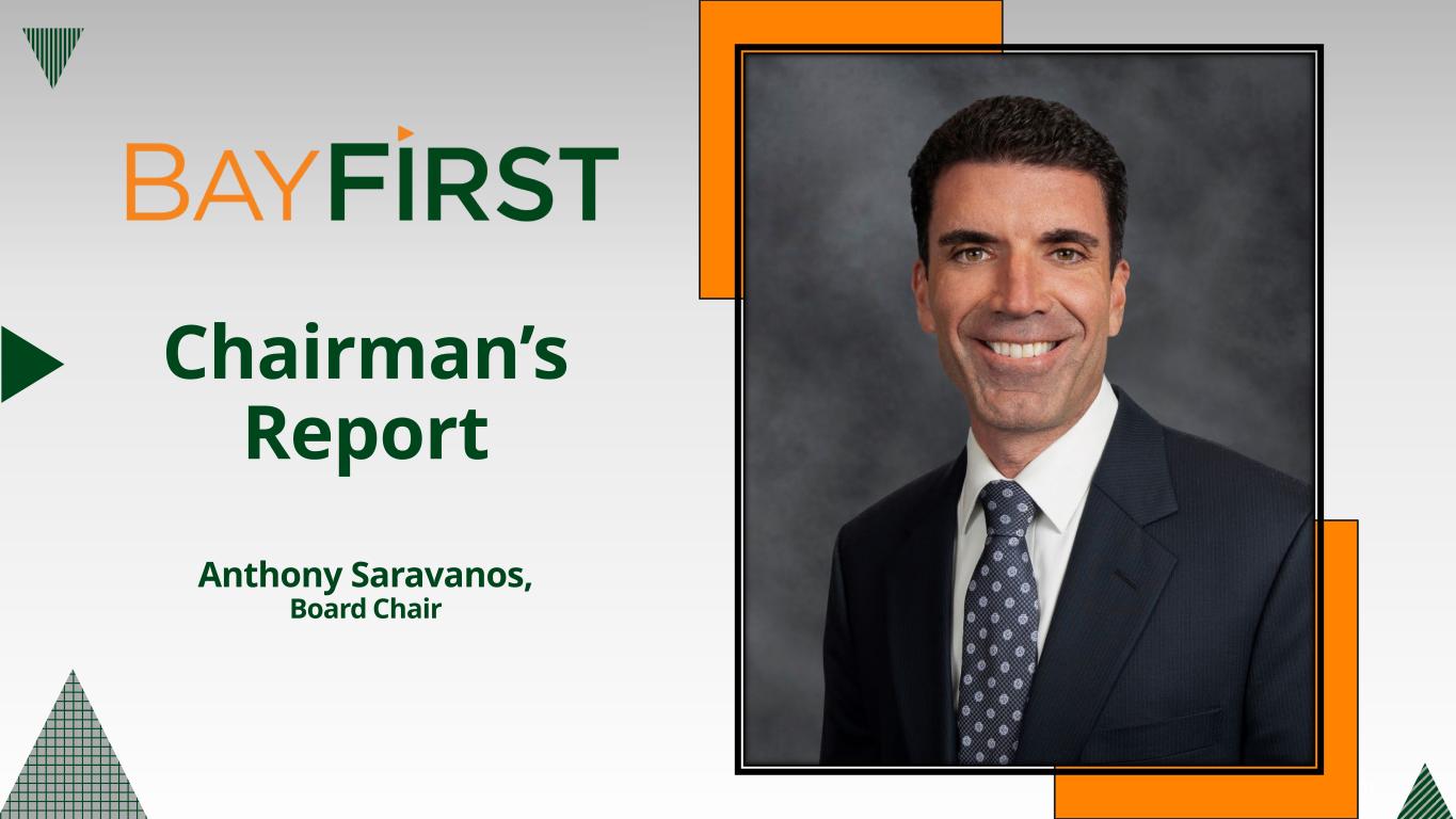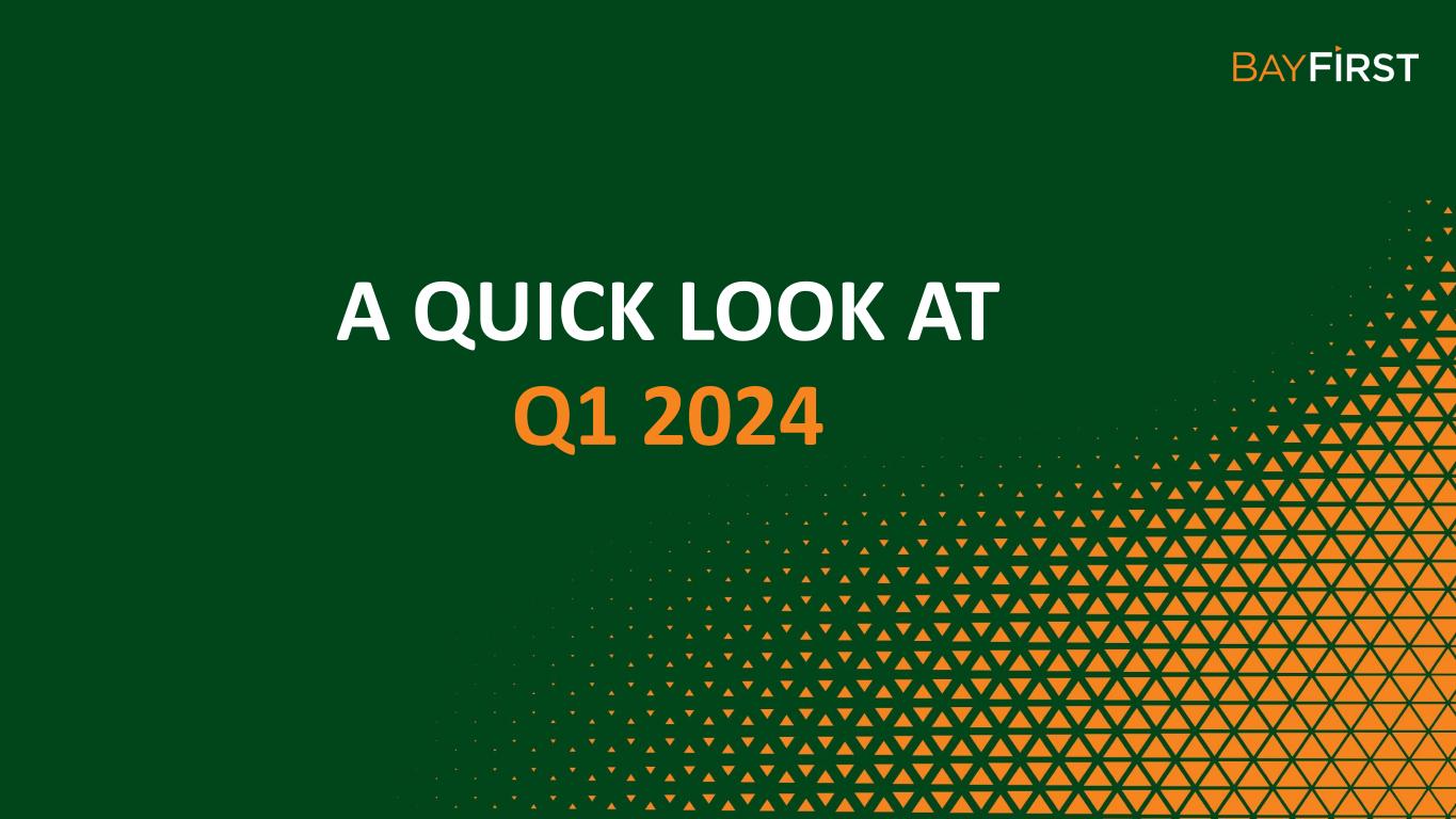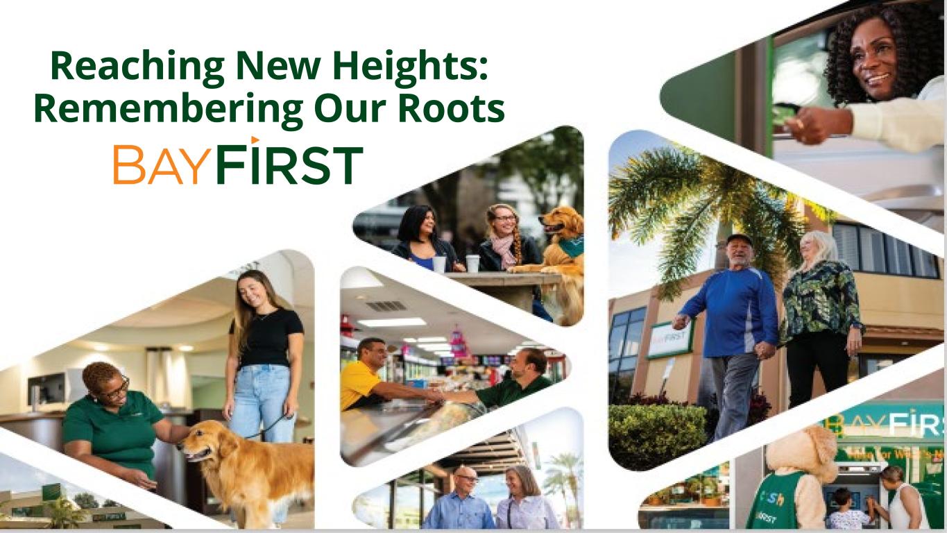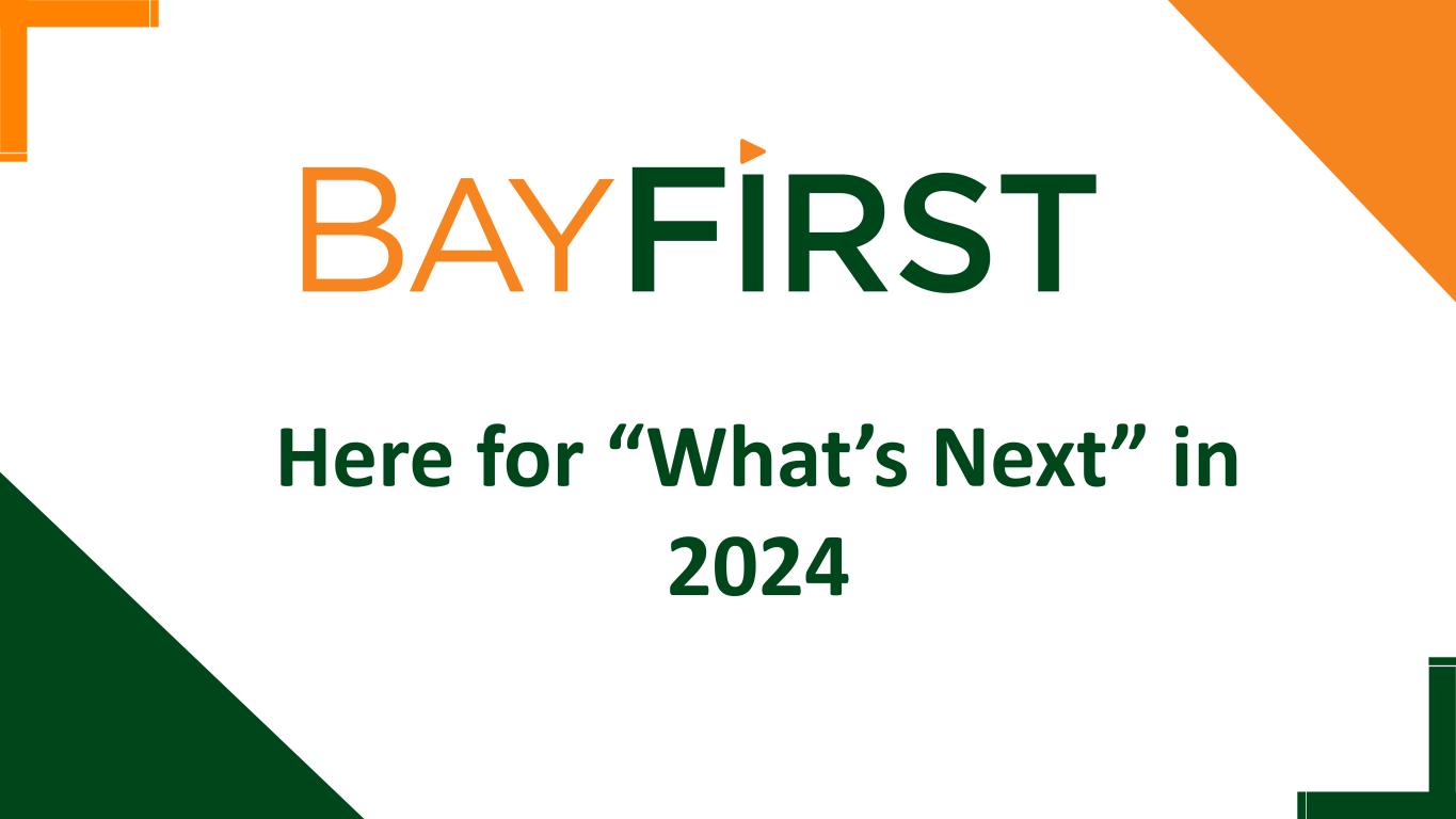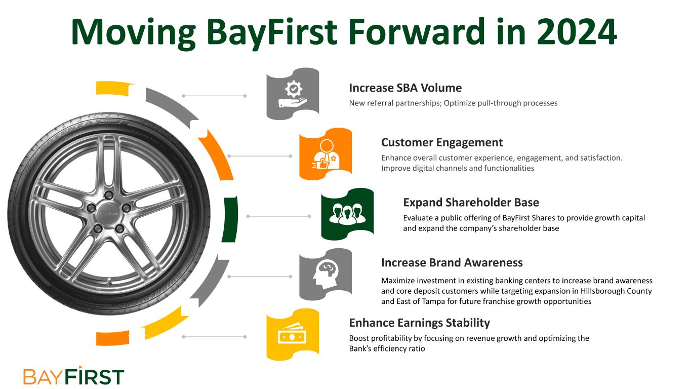 New referral partnerships; Optimize pull-through processes Increase SBA Volume Boost profitability by focusing on revenue growth and optimizing the Bank’s efficiency ratio Enhance Earnings Stability Enhance overall customer experience, engagement, and satisfaction. Improve digital channels and functionalities Customer Engagement Maximize investment in existing banking centers to increase brand awareness and core deposit customers while targeting expansion in Hillsborough County and East of Tampa for future franchise growth opportunities Increase Brand Awareness Evaluate a public offering of BayFirst Shares to provide growth capital and expand the company’s shareholder base Expand Shareholder Base Moving BayFirst Forward in 2024