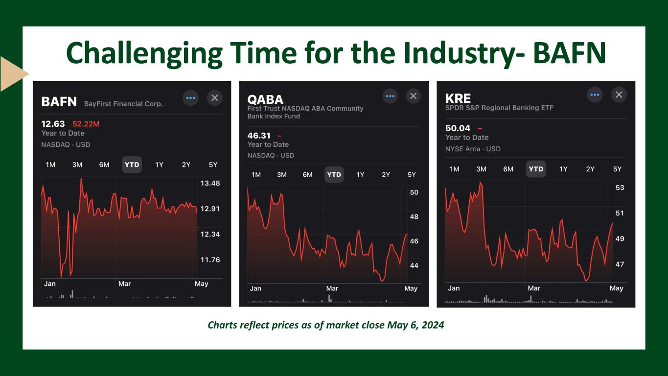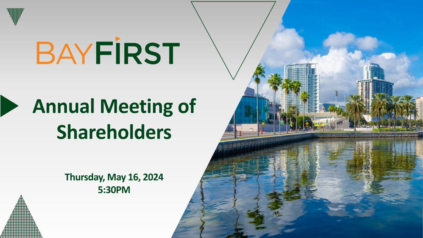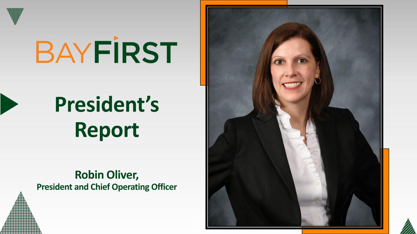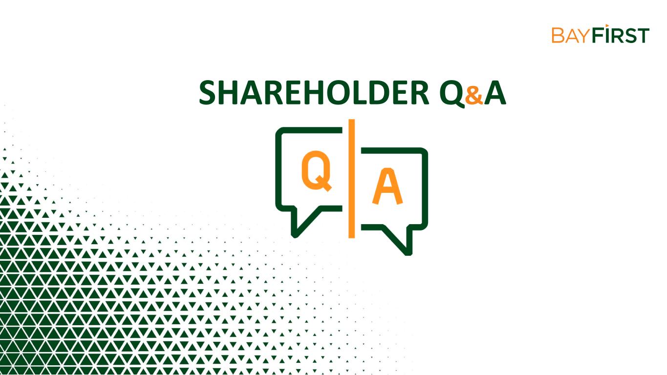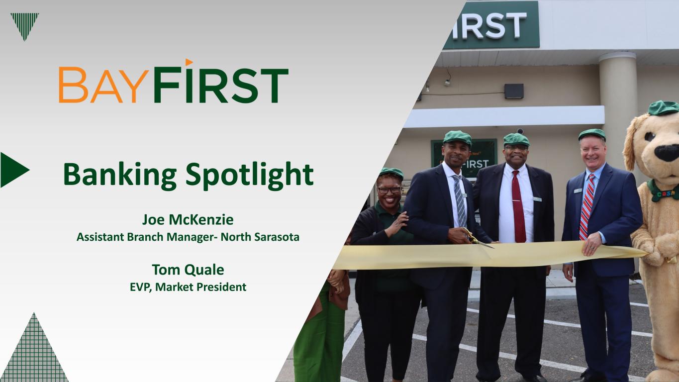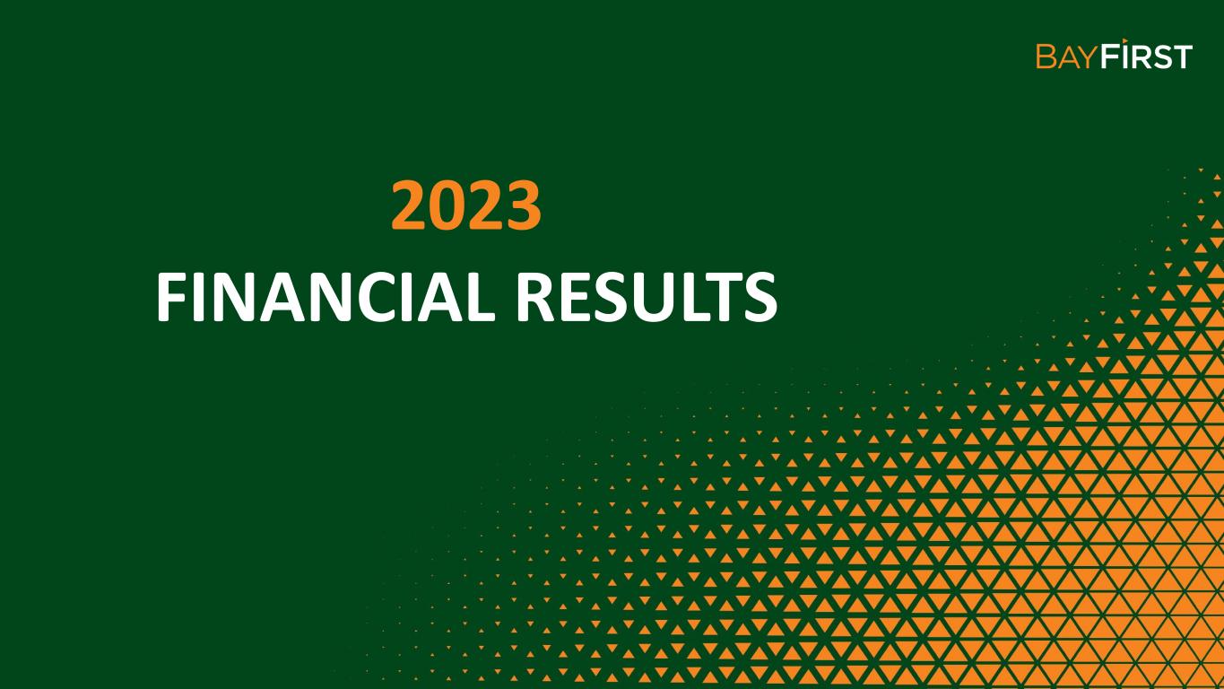 New referral partnerships; Optimize pull-through processes Increase SBA Volume Boost profitability by focusing on revenue growth and optimizing the Bank’s efficiency ratio Enhance Earnings Stability Enhance overall customer experience, engagement, and satisfaction. Improve digital channels and functionalities Customer Engagement Maximize investment in existing banking centers to increase brand awareness and core deposit customers while targeting expansion in Hillsborough County and East of Tampa for future franchise growth opportunities Increase Brand Awareness Evaluate a public offering of BayFirst Shares to provide growth capital and expand the company’s shareholder base Expand Shareholder Base Moving BayFirst Forward in 2024