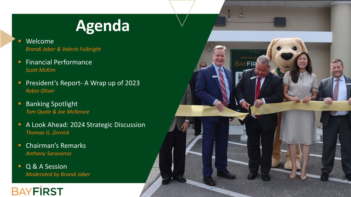  Welcome Brandi Jaber & Valerie Fulbright  Financial Performance Scott McKim  President’s Report- A Wrap up of 2023 Robin Oliver  Banking Spotlight Tom Quale & Joe McKenzie  A Look Ahead: 2024 Strategic Discussion Thomas G. Zernick  Chairman’s Remarks Anthony Saravanos  Q & A Session Moderated by Brandi Jaber Agenda