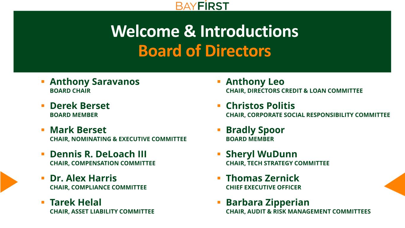 Welcome & Introductions Board of Directors  Anthony Saravanos BOARD CHAIR  Derek Berset BOARD MEMBER  Mark Berset CHAIR, NOMINATING & EXECUTIVE COMMITTEE  Dennis R. DeLoach III CHAIR, COMPENSATION COMMITTEE  Dr. Alex Harris CHAIR, COMPLIANCE COMMITTEE  Tarek Helal CHAIR, ASSET LIABILITY COMMITTEE  Anthony Leo CHAIR, DIRECTORS CREDIT & LOAN COMMITTEE  Christos Politis CHAIR, CORPORATE SOCIAL RESPONSIBILITY COMMITTEE  Bradly Spoor BOARD MEMBER  Sheryl WuDunn CHAIR, TECH STRATEGY COMMITTEE  Thomas Zernick CHIEF EXECUTIVE OFFICER  Barbara Zipperian CHAIR, AUDIT & RISK MANAGEMENT COMMITTEES
