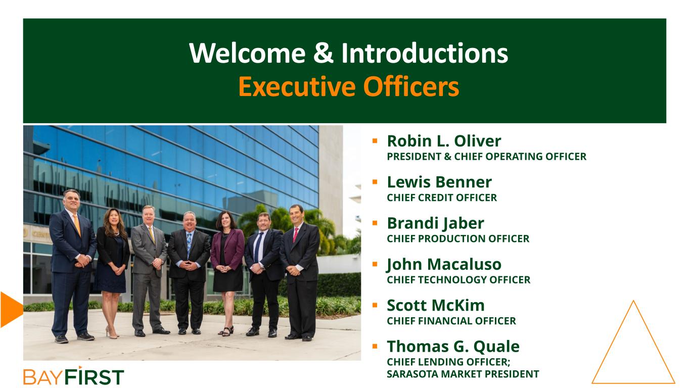 Welcome & Introductions Executive Officers  Robin L. Oliver PRESIDENT & CHIEF OPERATING OFFICER  Lewis Benner CHIEF CREDIT OFFICER  Brandi Jaber CHIEF PRODUCTION OFFICER  John Macaluso CHIEF TECHNOLOGY OFFICER  Scott McKim CHIEF FINANCIAL OFFICER  Thomas G. Quale CHIEF LENDING OFFICER; SARASOTA MARKET PRESIDENT