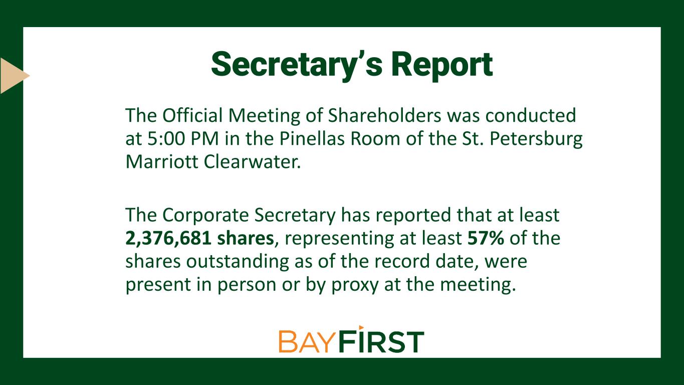 Secretary’s Report The Official Meeting of Shareholders was conducted at 5:00 PM in the Pinellas Room of the St. Petersburg Marriott Clearwater. The Corporate Secretary has reported that at least 2,376,681 shares, representing at least 57% of the shares outstanding as of the record date, were present in person or by proxy at the meeting.