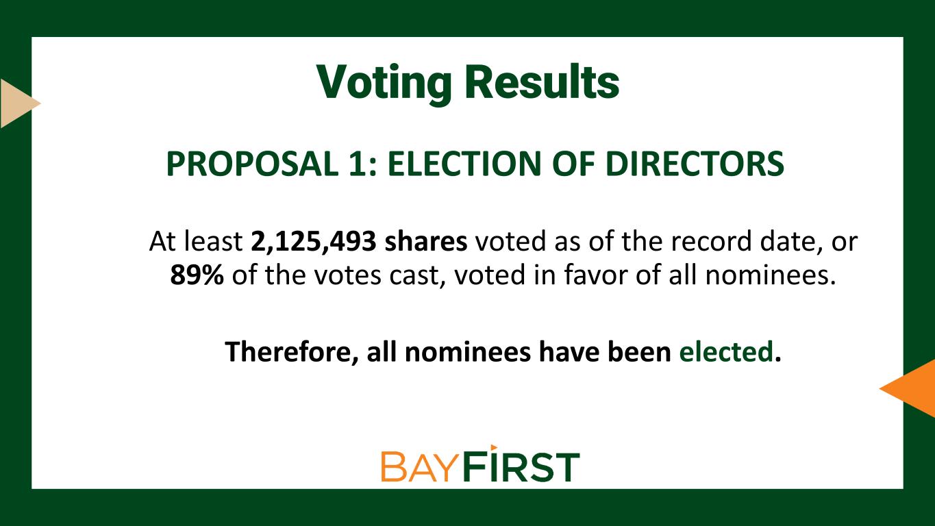 PROPOSAL 1: ELECTION OF DIRECTORS At least 2,125,493 shares voted as of the record date, or 89% of the votes cast, voted in favor of all nominees. Therefore, all nominees have been elected. Voting Results