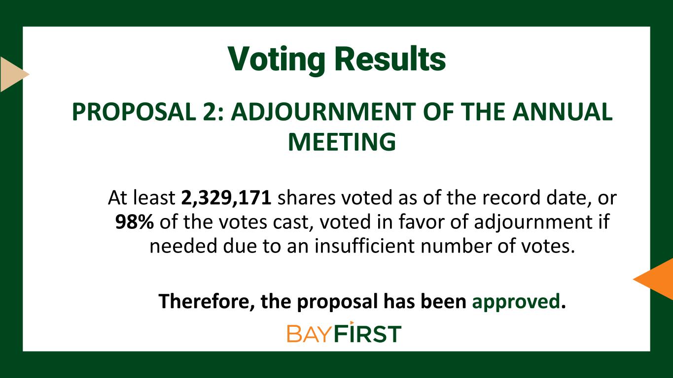 Voting Results PROPOSAL 2: ADJOURNMENT OF THE ANNUAL MEETING At least 2,329,171 shares voted as of the record date, or 98% of the votes cast, voted in favor of adjournment if needed due to an insufficient number of votes. Therefore, the proposal has been approved.