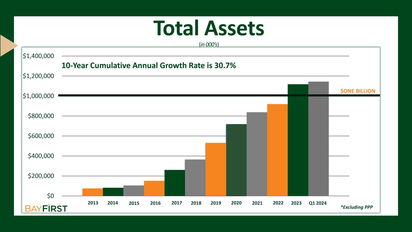 Total Assets (in 000’s) 2013 2014 2015 2016 2017 2018 2019 2020 2021 2022 2023 Q1 2024 $0 $200,000 $400,000 $600,000 $800,000 $1,000,000 $1,200,000 $1,400,000 $ONE BILLION 10-Year Cumulative Annual Growth Rate is 30.7% *Excluding PPP