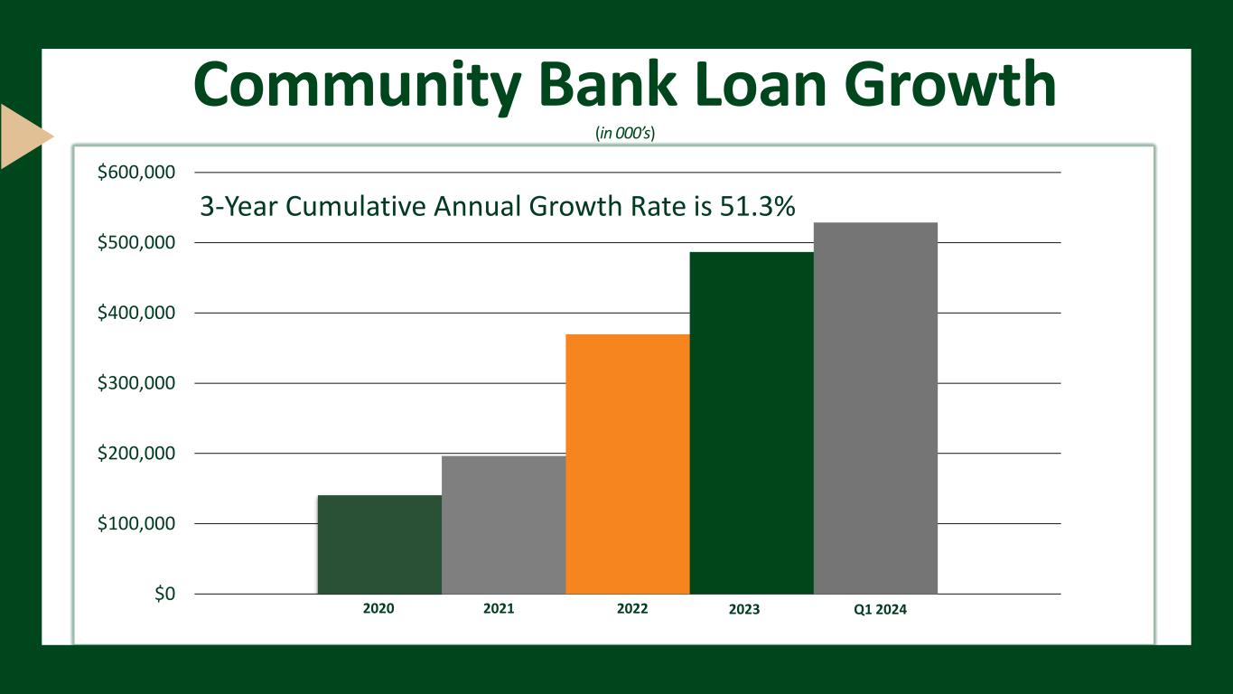 2020 2021 2022 2023 Q1 2024 $0 $100,000 $200,000 $300,000 $400,000 $500,000 $600,000 3-Year Cumulative Annual Growth Rate is 51.3% Community Bank Loan Growth (in 000’s)