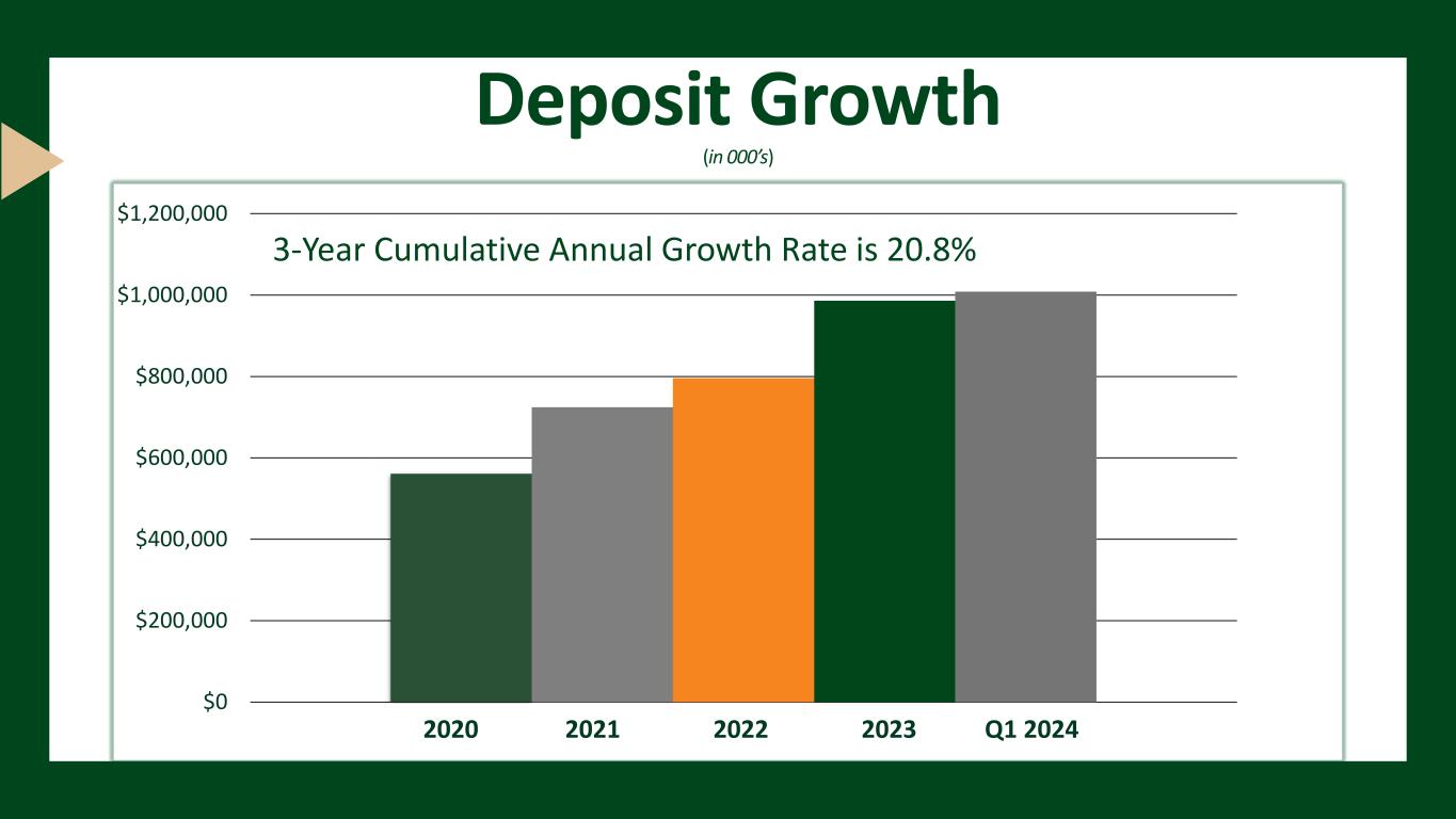 2020 2021 2022 2023 Q1 2024 $0 $200,000 $400,000 $600,000 $800,000 $1,000,000 $1,200,000 3-Year Cumulative Annual Growth Rate is 20.8% Deposit Growth (in 000’s)