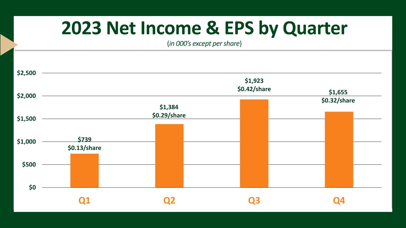 $739 $0.13/share $1,384 $0.29/share $1,923 $0.42/share $1,655 $0.32/share $0 $500 $1,000 $1,500 $2,000 $2,500 Q1 Q2 Q3 Q4 2023 Net Income & EPS by Quarter (in 000’s except per share)