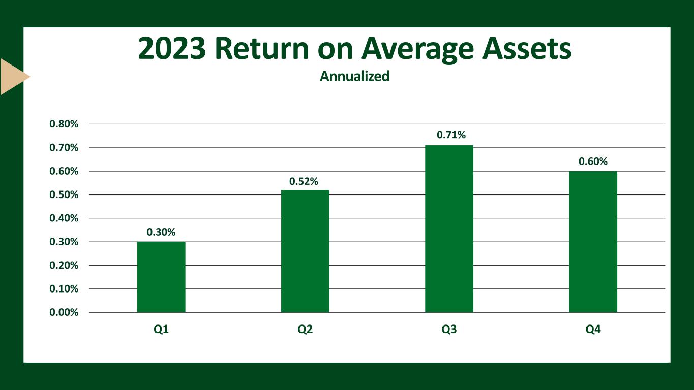 2023 Return on Average Assets Annualized 0.30% 0.52% 0.71% 0.60% 0.00% 0.10% 0.20% 0.30% 0.40% 0.50% 0.60% 0.70% 0.80% Q1 Q2 Q3 Q4