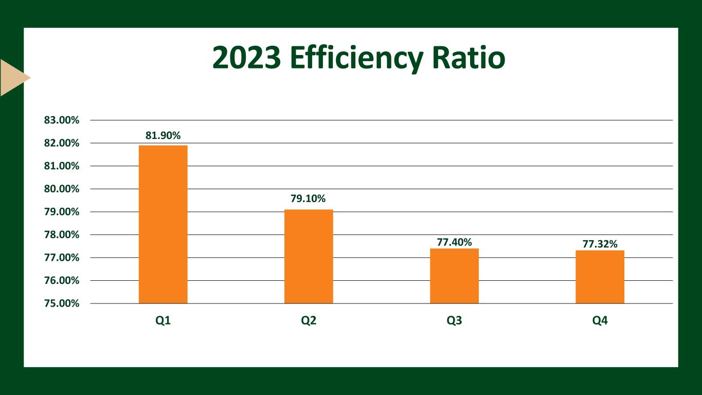 2023 Efficiency Ratio 81.90% 79.10% 77.40% 77.32% 75.00% 76.00% 77.00% 78.00% 79.00% 80.00% 81.00% 82.00% 83.00% Q1 Q2 Q3 Q4