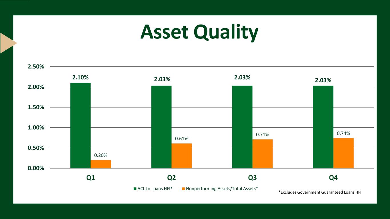 Asset Quality 2.10% 2.03% 2.03% 2.03% 0.20% 0.61% 0.71% 0.74% 0.00% 0.50% 1.00% 1.50% 2.00% 2.50% Q1 Q2 Q3 Q4 ACL to Loans HFI* Nonperforming Assets/Total Assets* *Excludes Government Guaranteed Loans HFI