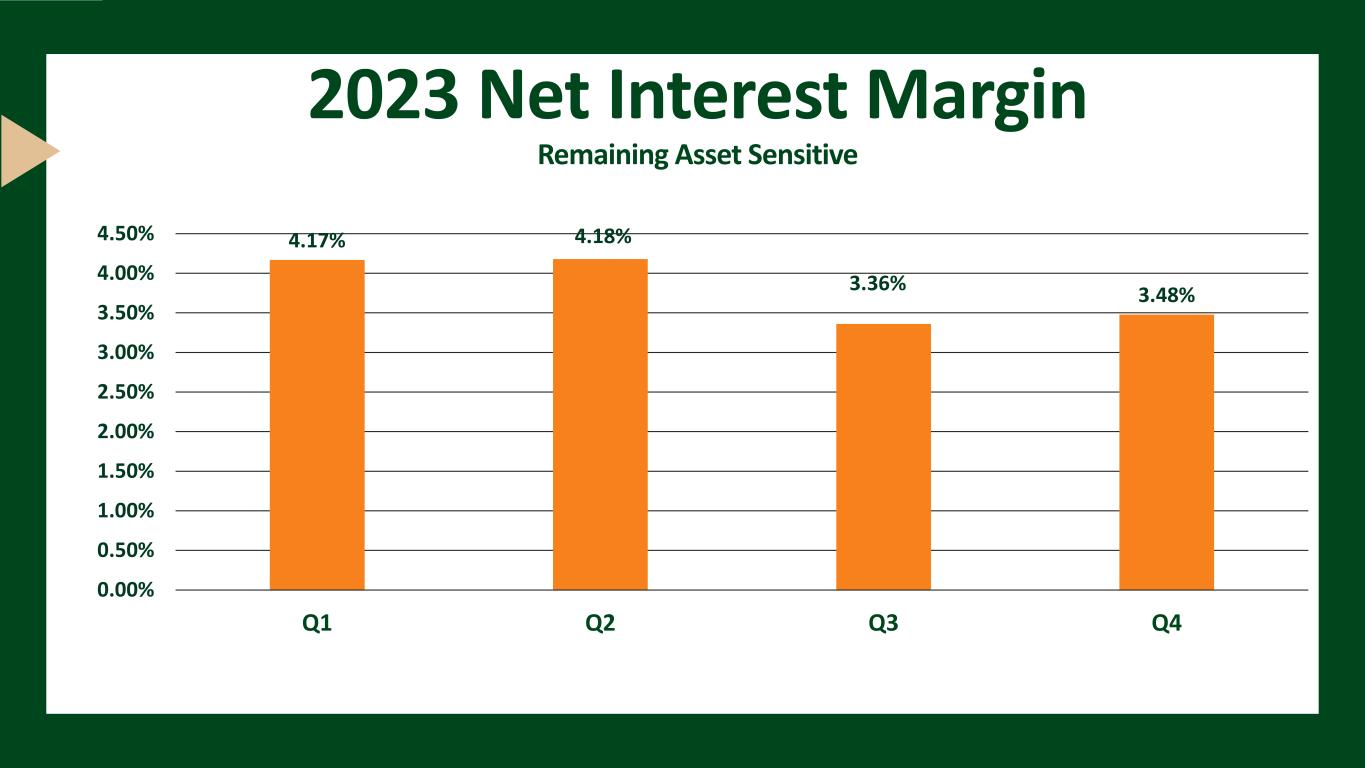 2023 Net Interest Margin Remaining Asset Sensitive 4.17% 4.18% 3.36% 3.48% 0.00% 0.50% 1.00% 1.50% 2.00% 2.50% 3.00% 3.50% 4.00% 4.50% Q1 Q2 Q3 Q4