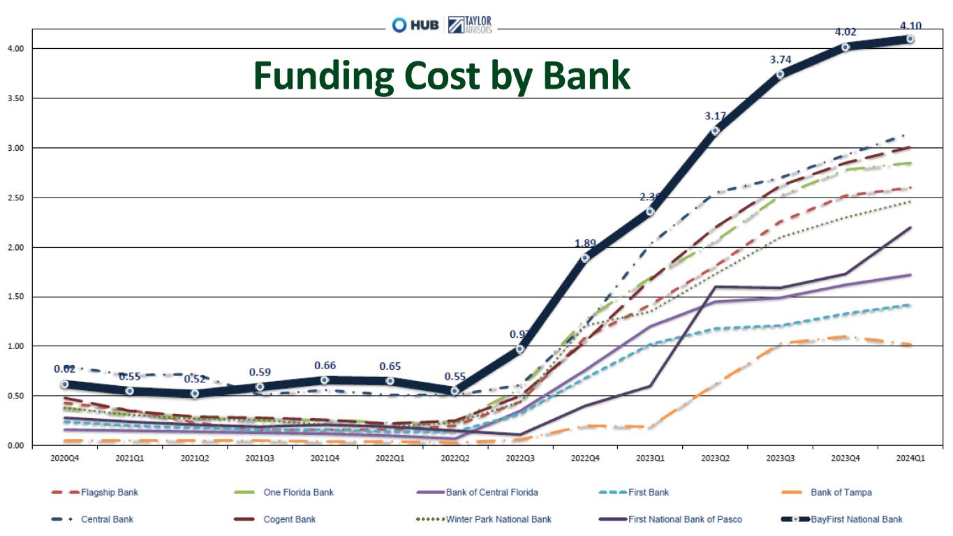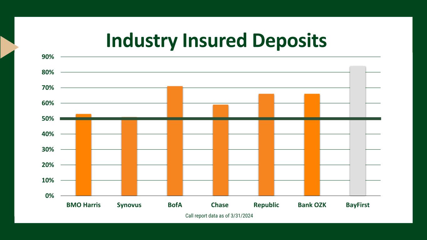 Industry Insured Deposits 0% 10% 20% 30% 40% 50% 60% 70% 80% 90% BMO Harris Synovus BofA Chase Republic Bank OZK BayFirst Call report data as of 3/31/2024
