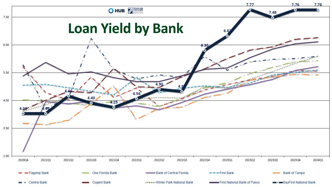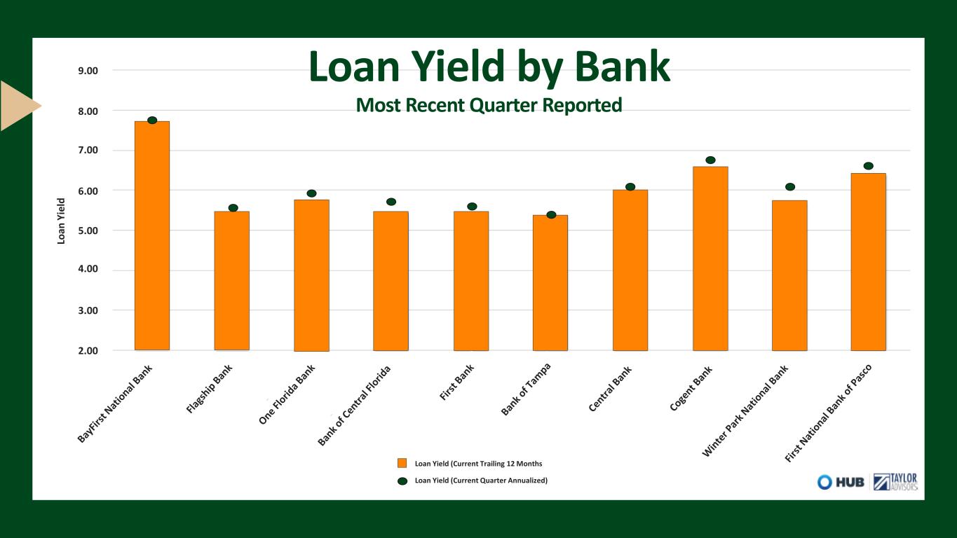 Loan Yield by Bank Most Recent Quarter Reported 2.00 3.00 4.00 5.00 6.00 7.00 8.00 9.00 Loan Yield (Current Trailing 12 Months Loan Yield (Current Quarter Annualized) Lo an Y ie ld