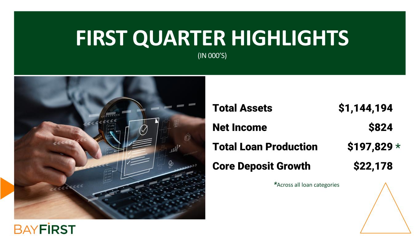 FIRST QUARTER HIGHLIGHTS (IN 000’S) Total Assets $1,144,194 Net Income $824 Total Loan Production $197,829 Core Deposit Growth $22,178 * *Across all loan categories