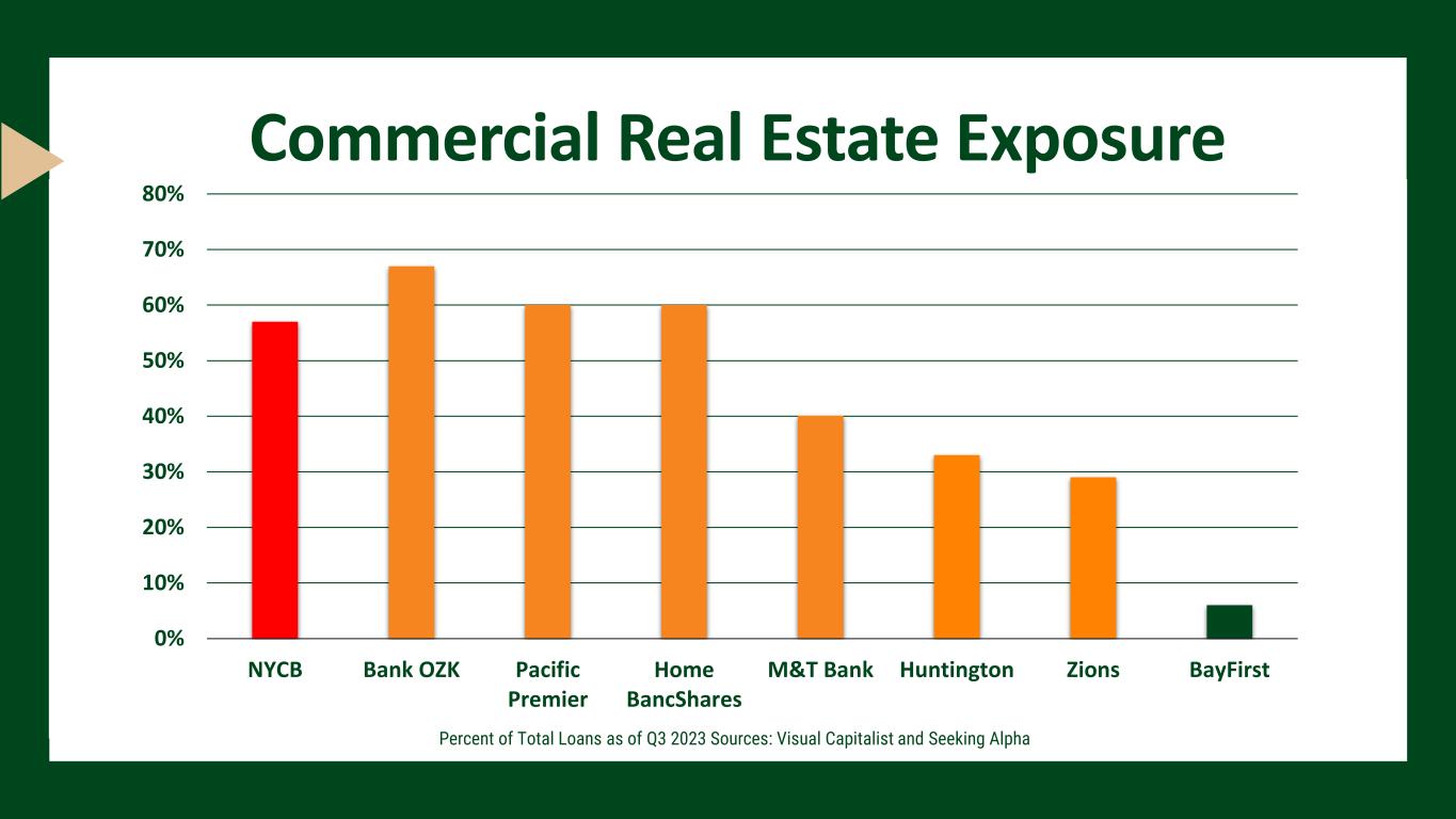Commercial Real Estate Exposure 0% 10% 20% 30% 40% 50% 60% 70% 80% NYCB Bank OZK Pacific Premier Home BancShares M&T Bank Huntington Zions BayFirst Percent of Total Loans as of Q3 2023 Sources: Visual Capitalist and Seeking Alpha