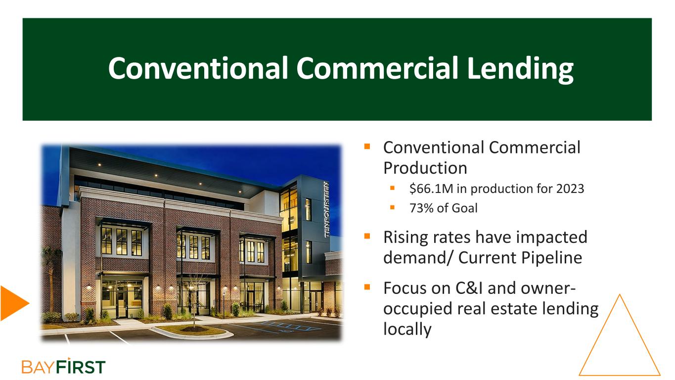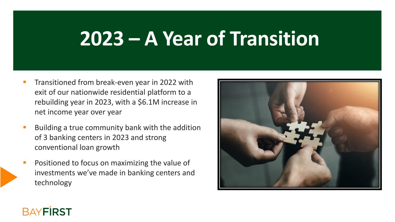2023 – A Year of Transition  Transitioned from break-even year in 2022 with exit of our nationwide residential platform to a rebuilding year in 2023, with a $6.1M increase in net income year over year  Building a true community bank with the addition of 3 banking centers in 2023 and strong conventional loan growth  Positioned to focus on maximizing the value of investments we’ve made in banking centers and technology