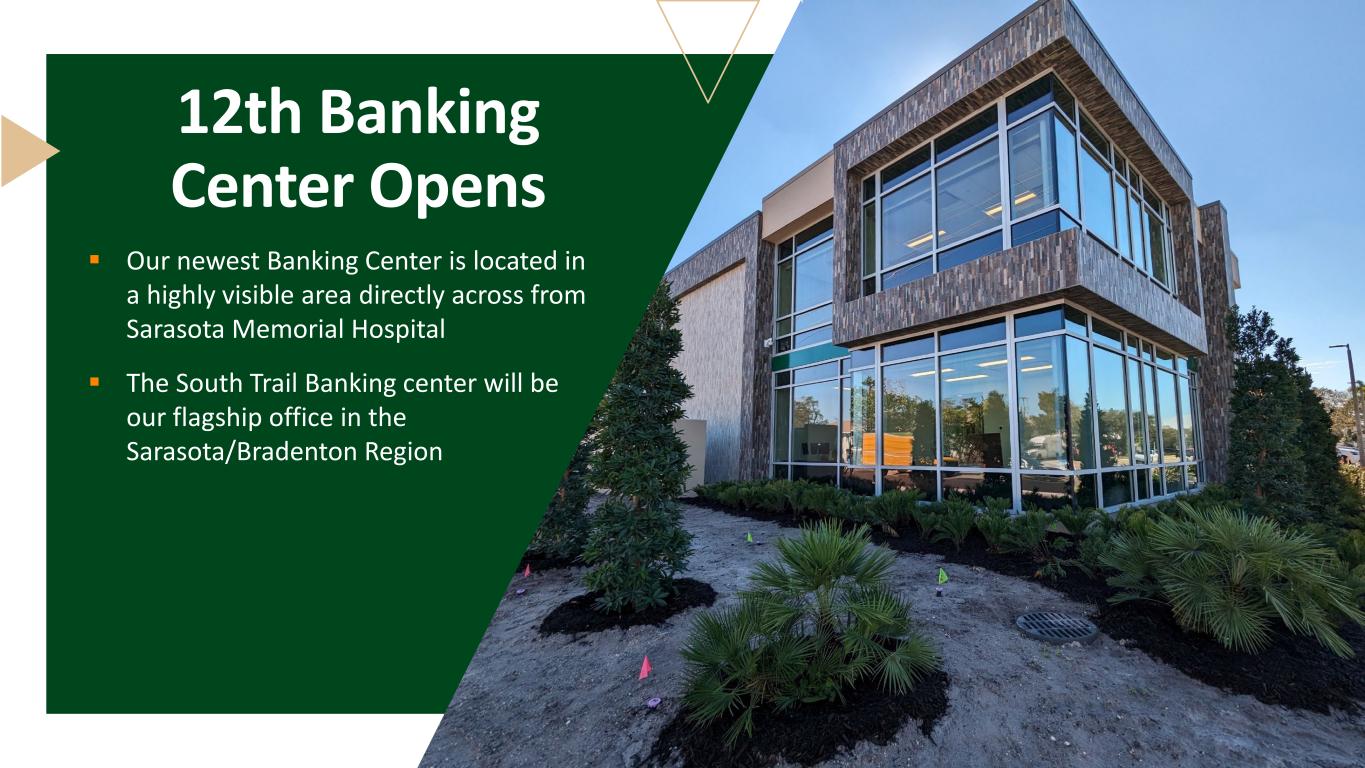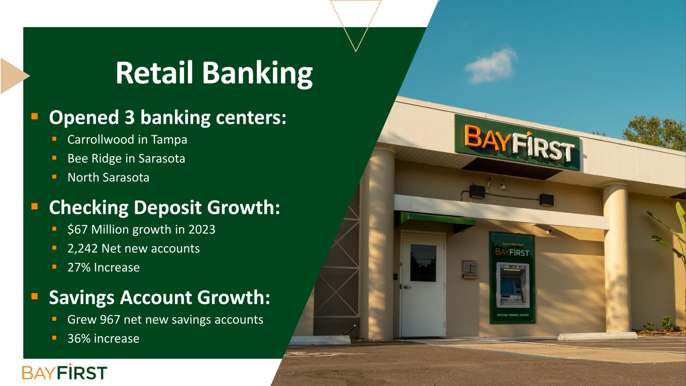  Opened 3 banking centers:  Carrollwood in Tampa  Bee Ridge in Sarasota  North Sarasota  Checking Deposit Growth:  $67 Million growth in 2023  2,242 Net new accounts  27% Increase  Savings Account Growth:  Grew 967 net new savings accounts  36% increase Retail Banking