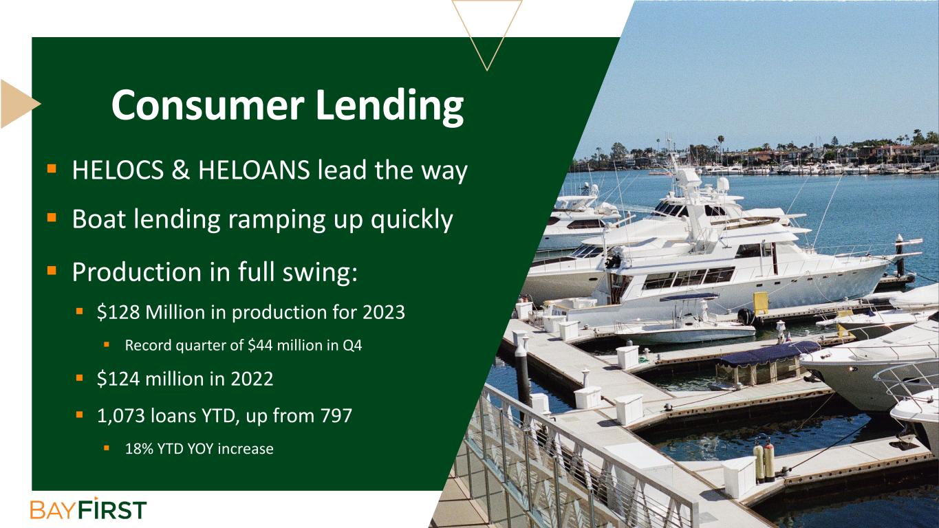  HELOCS & HELOANS lead the way  Boat lending ramping up quickly  Production in full swing:  $128 Million in production for 2023  Record quarter of $44 million in Q4  $124 million in 2022  1,073 loans YTD, up from 797  18% YTD YOY increase Consumer Lending