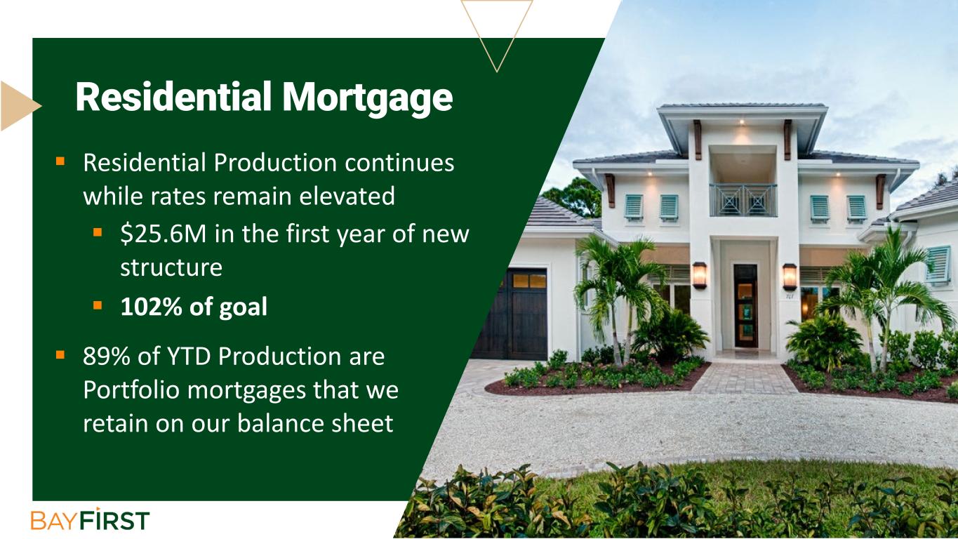  Residential Production continues while rates remain elevated  $25.6M in the first year of new structure  102% of goal  89% of YTD Production are Portfolio mortgages that we retain on our balance sheet Residential Mortgage