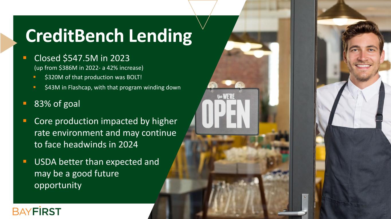  Closed $547.5M in 2023 (up from $386M in 2022- a 42% increase)  $320M of that production was BOLT!  $43M in Flashcap, with that program winding down  83% of goal  Core production impacted by higher rate environment and may continue to face headwinds in 2024  USDA better than expected and may be a good future opportunity CreditBench Lending