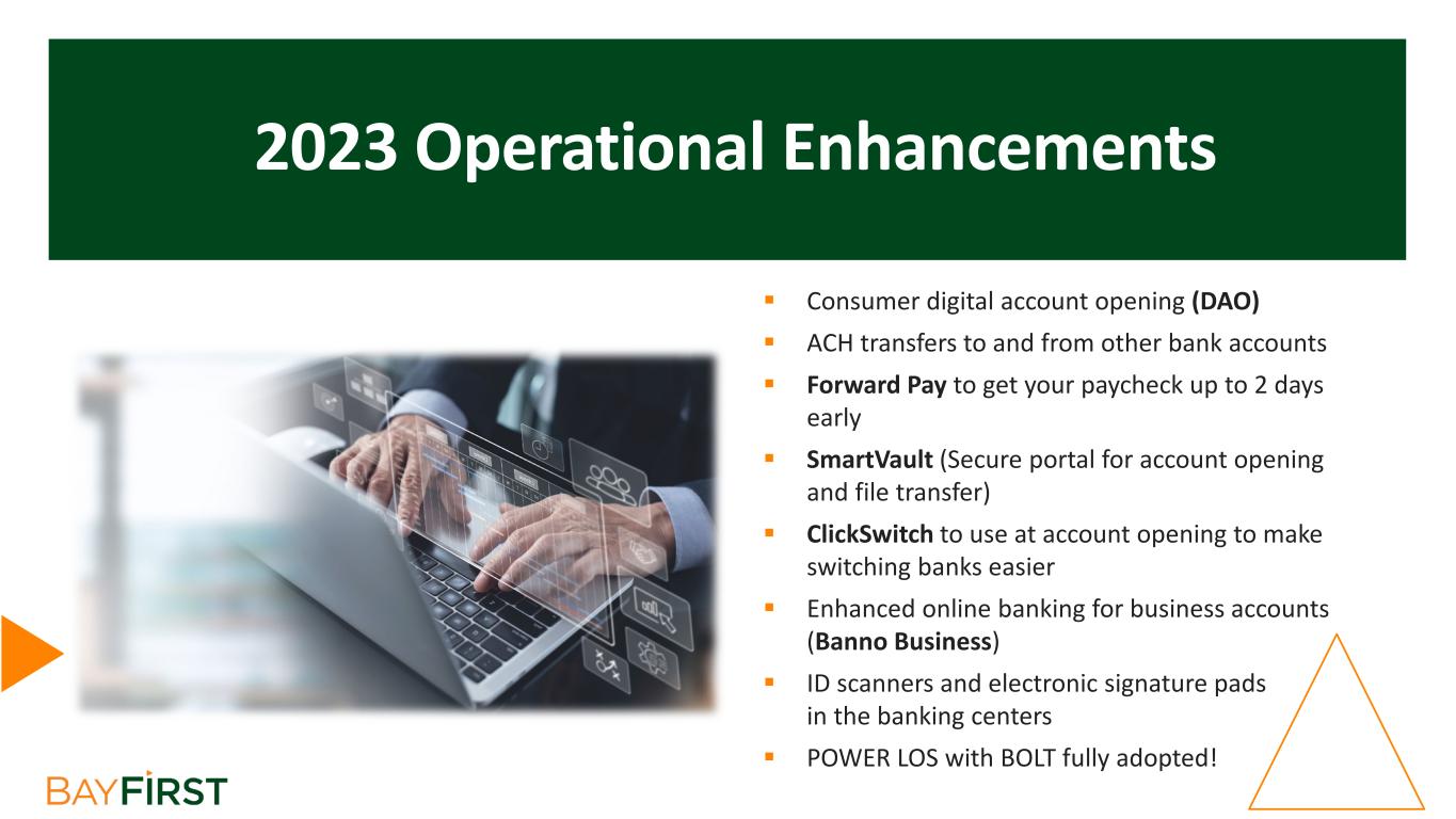 2023 Operational Enhancements  Consumer digital account opening (DAO)  ACH transfers to and from other bank accounts  Forward Pay to get your paycheck up to 2 days early  SmartVault (Secure portal for account opening and file transfer)  ClickSwitch to use at account opening to make switching banks easier  Enhanced online banking for business accounts (Banno Business)  ID scanners and electronic signature pads in the banking centers  POWER LOS with BOLT fully adopted!
