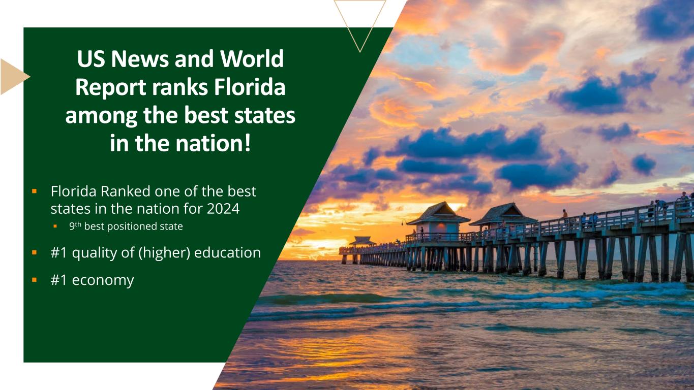  Florida Ranked one of the best states in the nation for 2024  9th best positioned state  #1 quality of (higher) education  #1 economy US News and World Report ranks Florida among the best states in the nation!