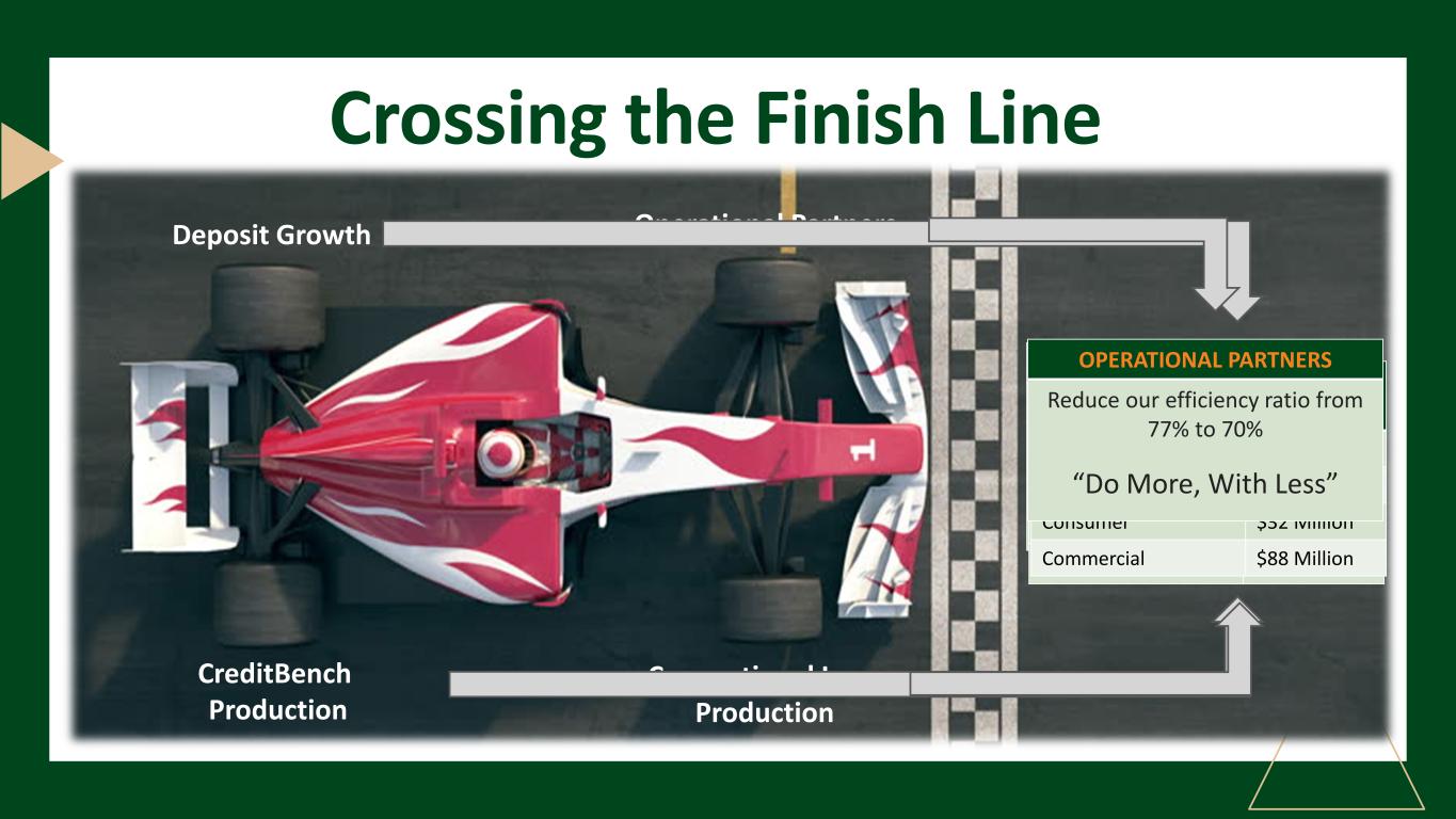 Crossing the Finish Line Deposit Growth CreditBench Production Operational Partners Conventional Loan Production DEPOSIT GROWTH Checking $43 Million Savings & MMA $9 Million Growth in Numbers of Checking & Savings Accounts 3,500 CREDITBENCH PRODUCTION Bolt $415 Million Core SBA $160 Million Core USDA $40 Million CONVENTIONAL LOAN PRODUCTION Residential Mortgage $28 Million Home Equity $1 0 illion nsumer 32 Million mmercial 88 illi OPERATIONAL PAR NERS R duce our efficiency ratio from 77% to 70% “Do Mor , With Less”