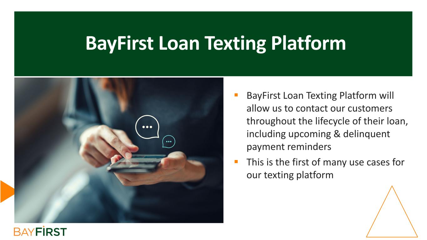 BayFirst Loan Texting Platform  BayFirst Loan Texting Platform will allow us to contact our customers throughout the lifecycle of their loan, including upcoming & delinquent payment reminders  This is the first of many use cases for our texting platform