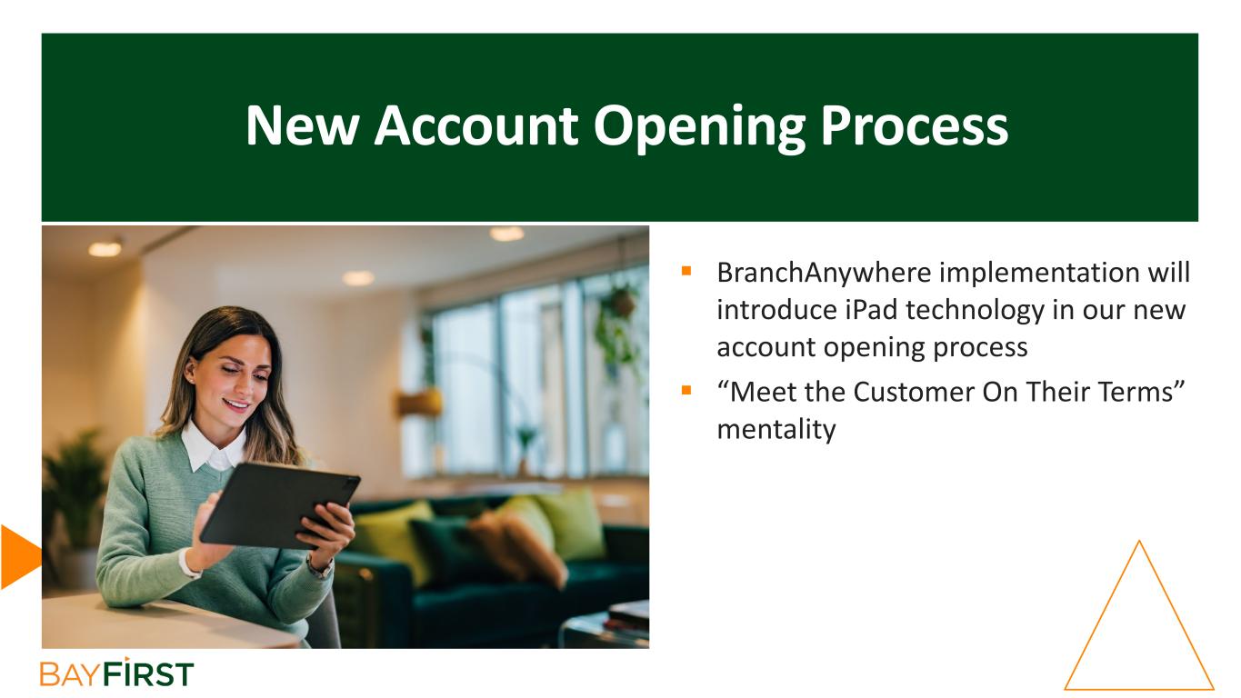 New Account Opening Process  BranchAnywhere implementation will introduce iPad technology in our new account opening process  “Meet the Customer On Their Terms” mentality